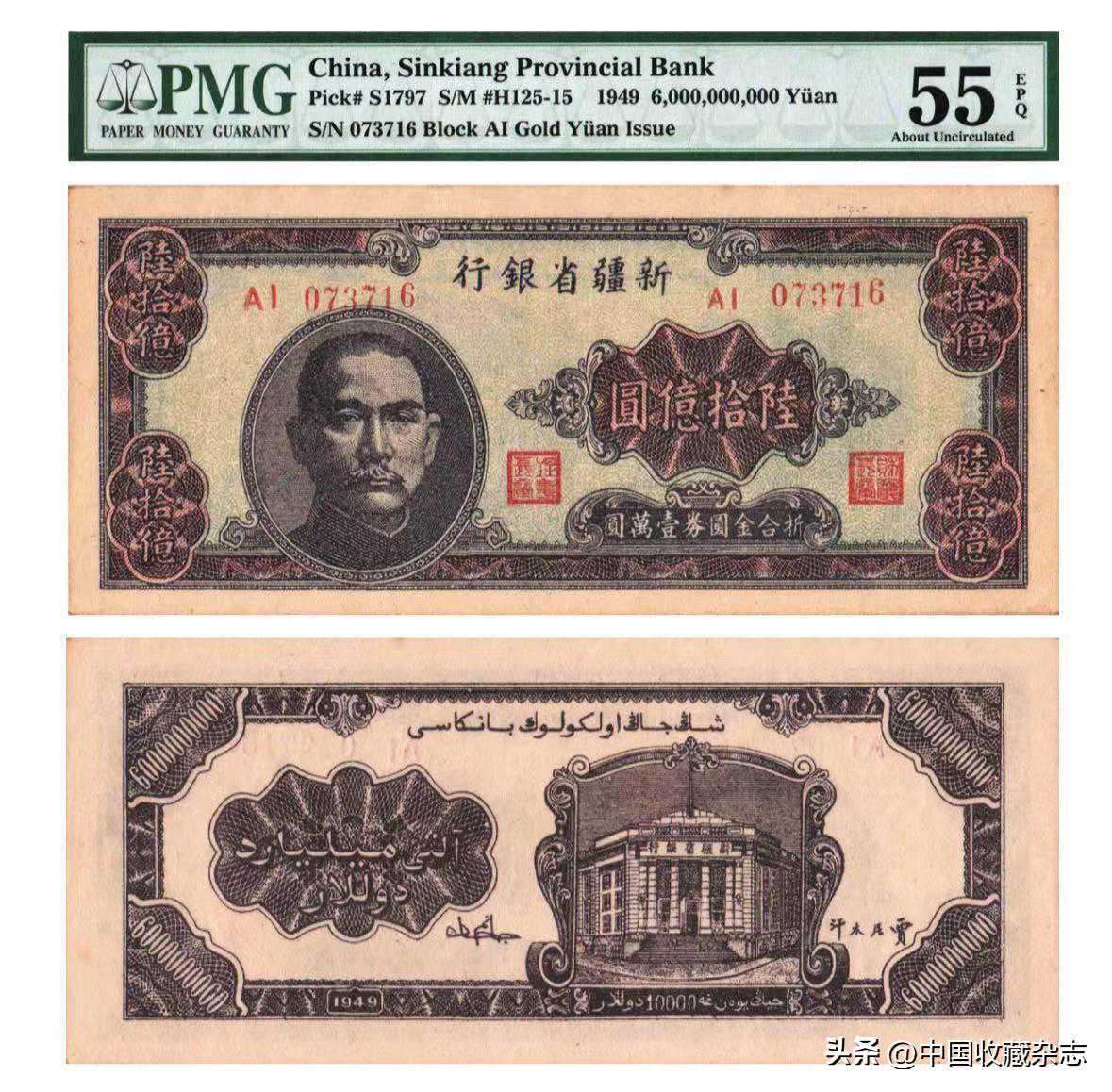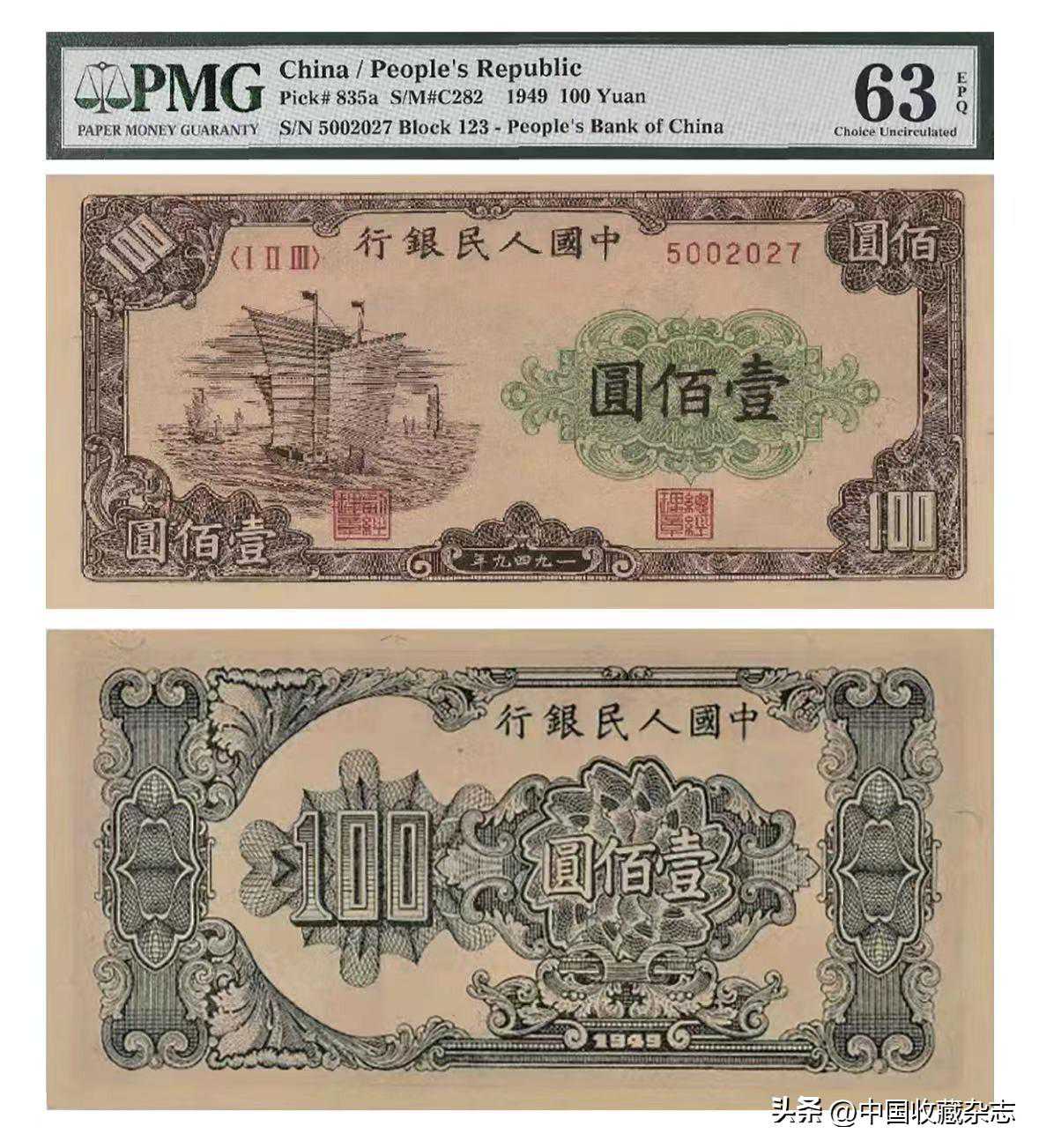 单字轨号码无4、7,经评PMG67EPQ,是该公司此品种中的最高分,台湾资深藏家出品。此品是中国农民银行纸币中的最大面值,由于流通习惯,将长方形的纸币从中对折方便收纳摆放,传承至今仍能有此品相实属不易,编号号码也深受藏家喜爱。