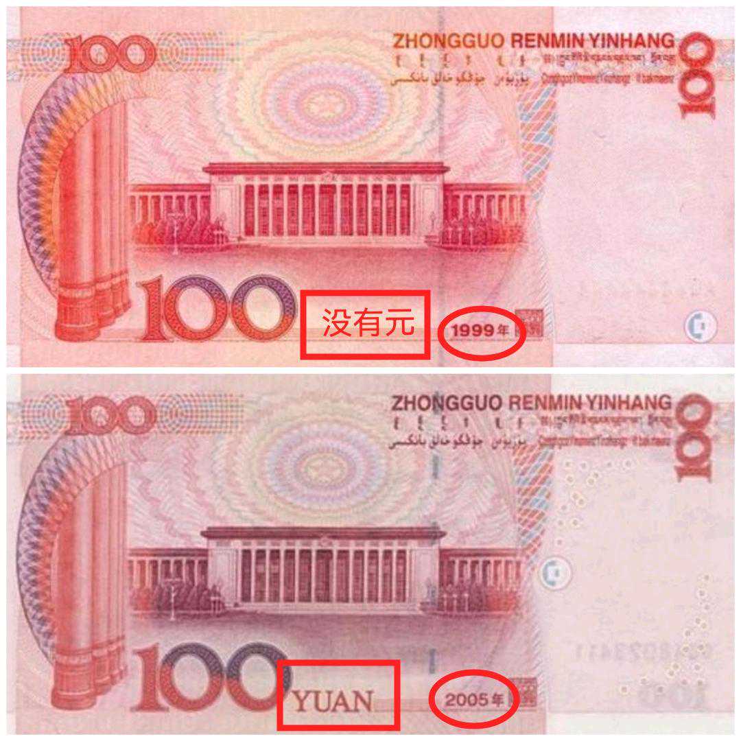 在不同的年份上,就拿第五套人民币100元来说,1999年的价值高于2005年,不是因为时间早晚的问题,而是1999年版的较为特殊,在纸币背面下方100后面缺少一个单位符号YUAN,因而流通没多久后,就改版发行了2005版。