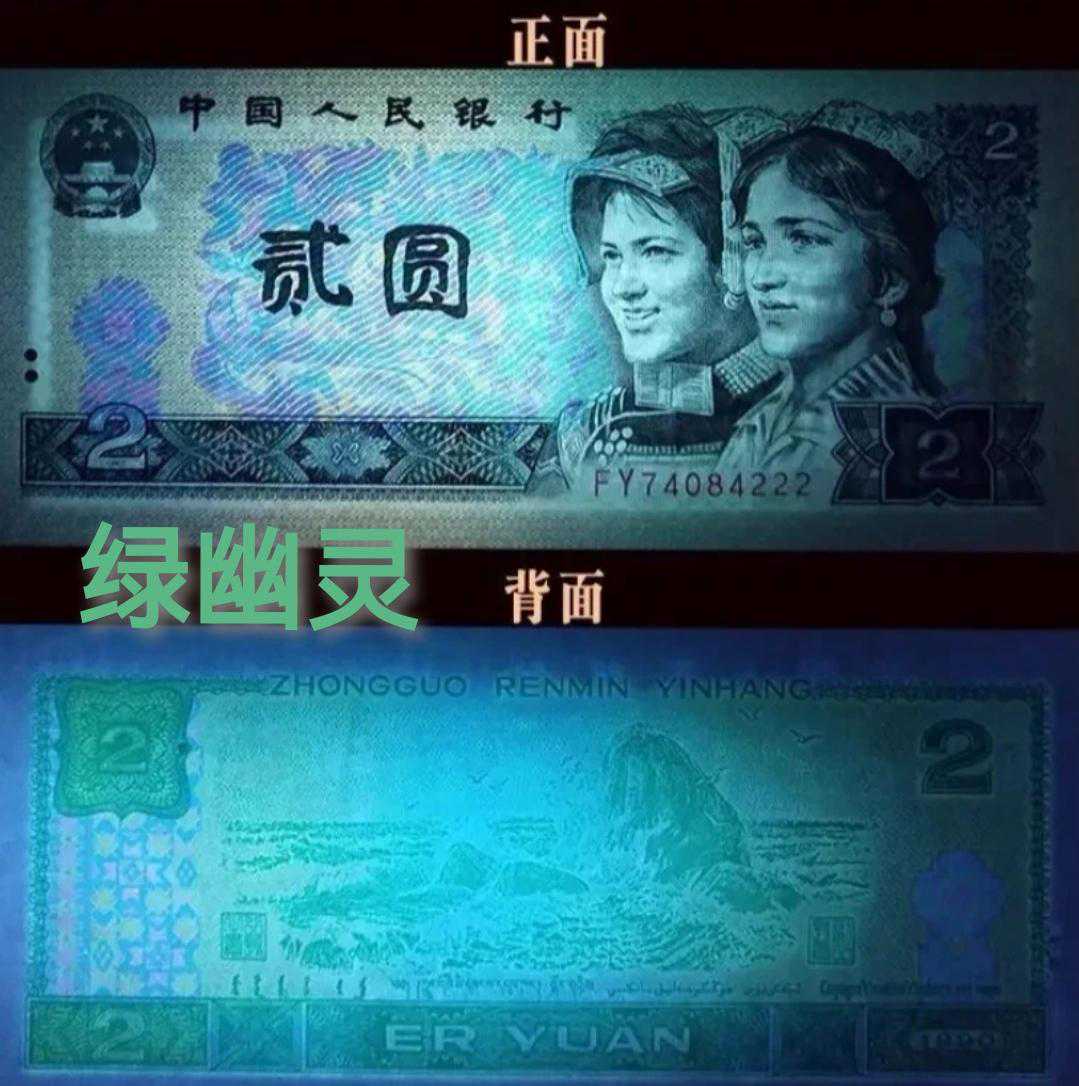 在版本上,有荧光版,水印版等等,就像这枚1990年贰元纸币,它在荧光下会散发出幽幽绿光,因此被称为绿幽灵,自然和普通无荧光的版别相比,具有更高的收藏价值。