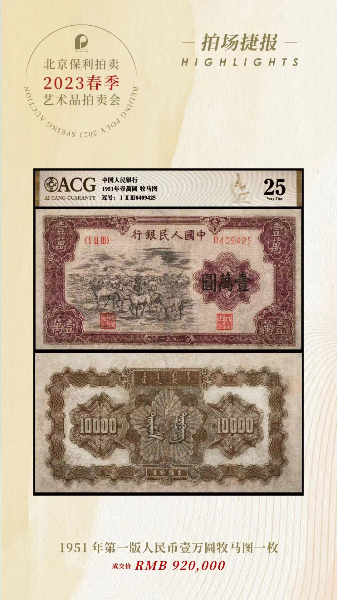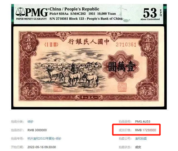在2022年,一张PMG53分EPQ的牧马图,最终以1725万的拍卖价成交,刷新中国纸钞拍卖的最高成交记录!