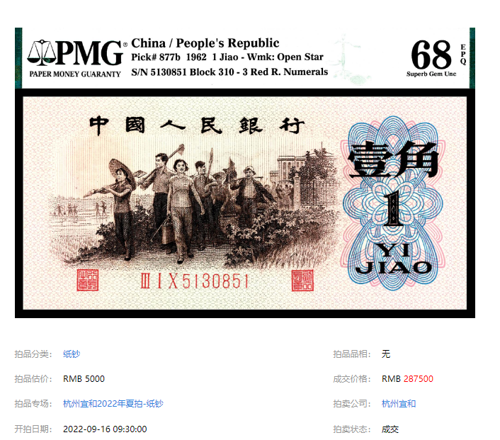 去年9月,一枚PMG68分的背水以287500元的高价成交;