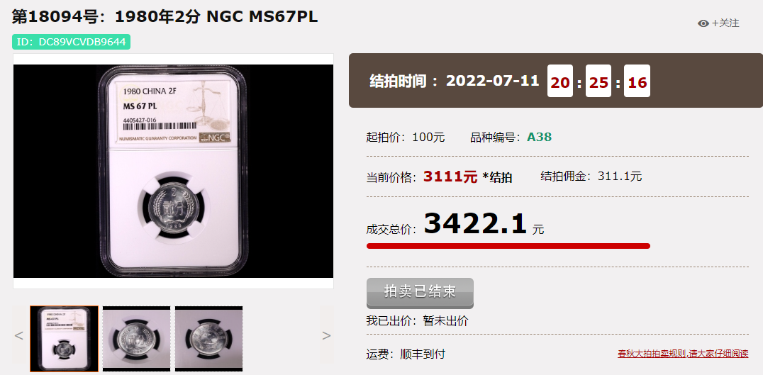 1980年2分,NGC67分的,成交价3422.1元;