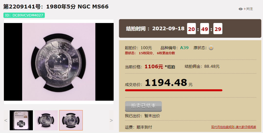 1980年5分,NGC66分,成交价1194.48元;