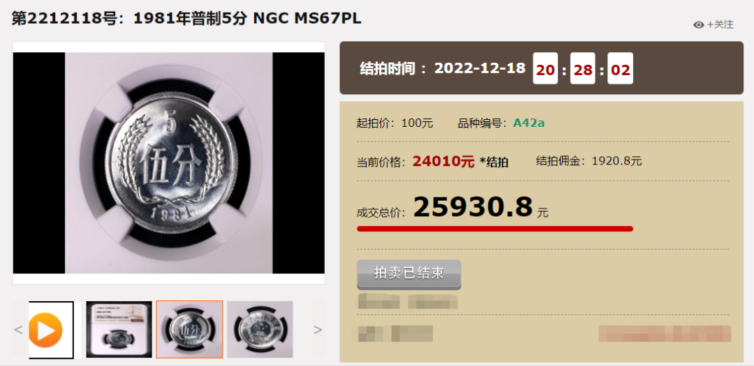 1981年5分,NGC67分,成交价25930.8元!