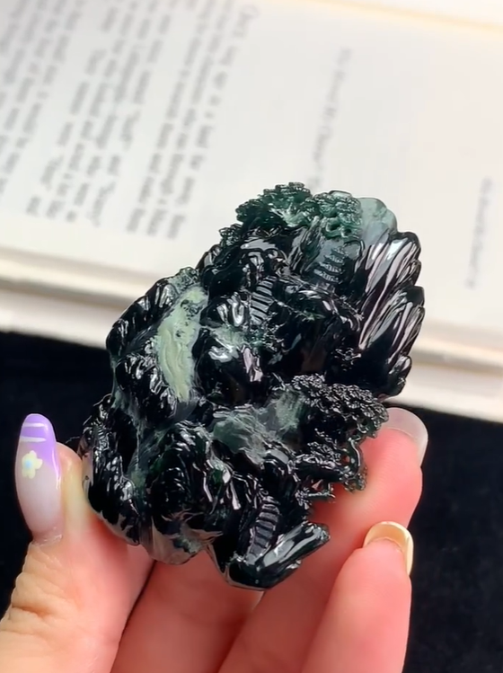 2.感受墨翠的重量和手感。真正的墨翠相对较重,手感坠手,而其他玉石则可能感觉轻飘飘的。