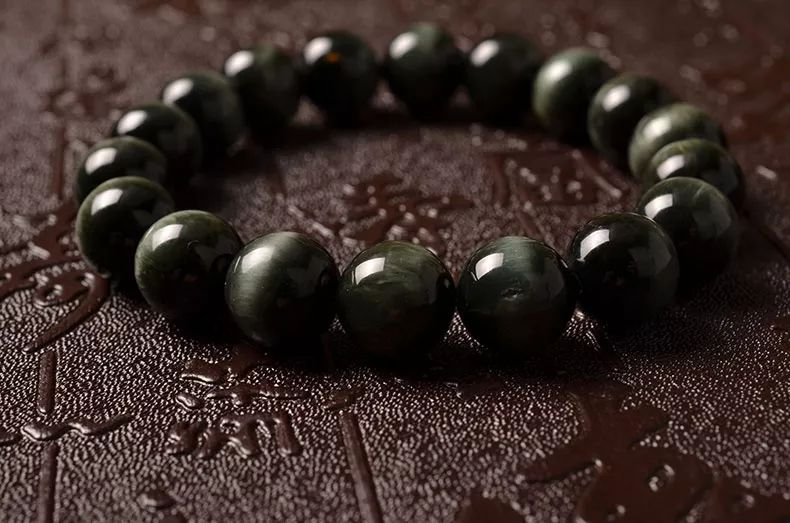 黑色角闪石玉中还可以看到内部含有金属光泽的矿物包裹体。由于结晶粗大,黑色角闪石玉的解理面的发育一般不具备玉石具有的细腻结构。它通常被制作为圆珠手链与墨翠手链混卖,但仔细观察可以发现其与墨翠的区别。