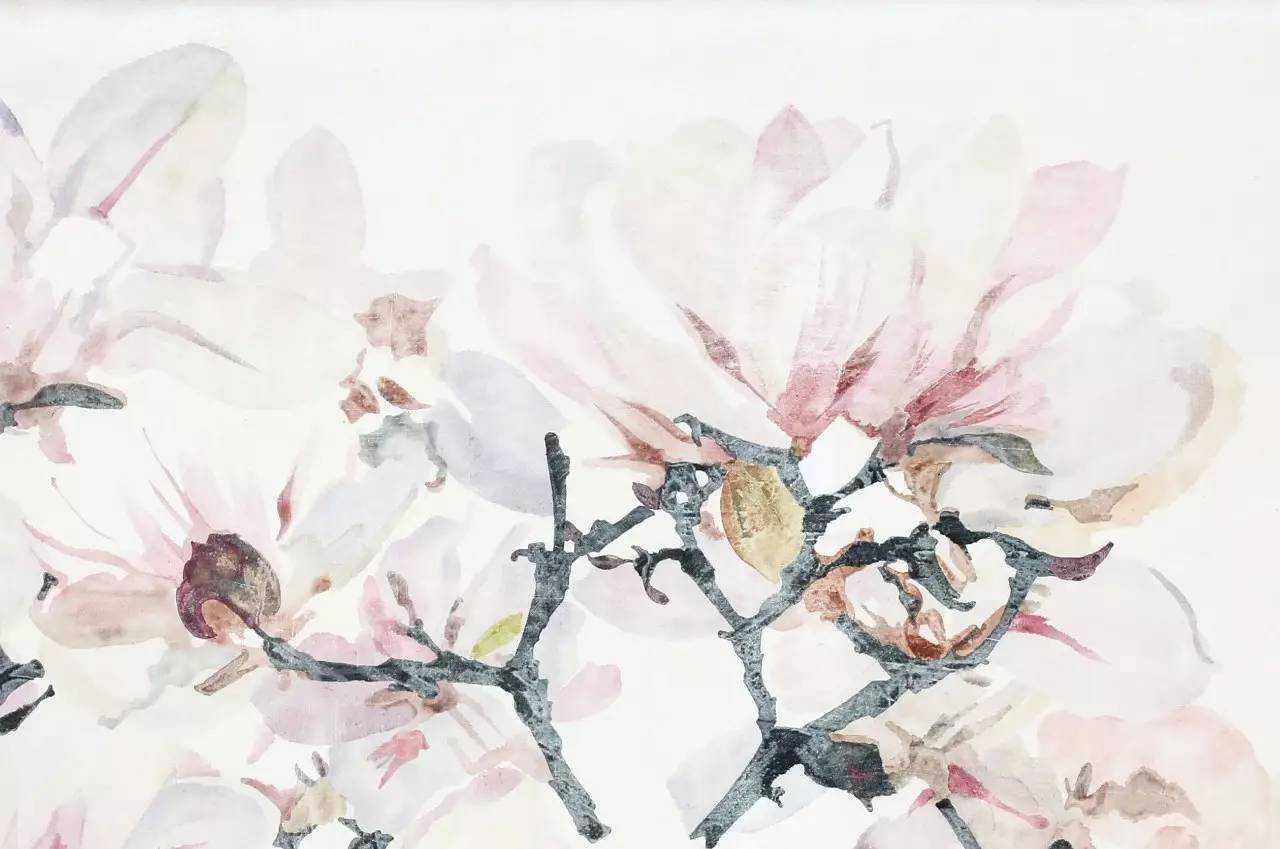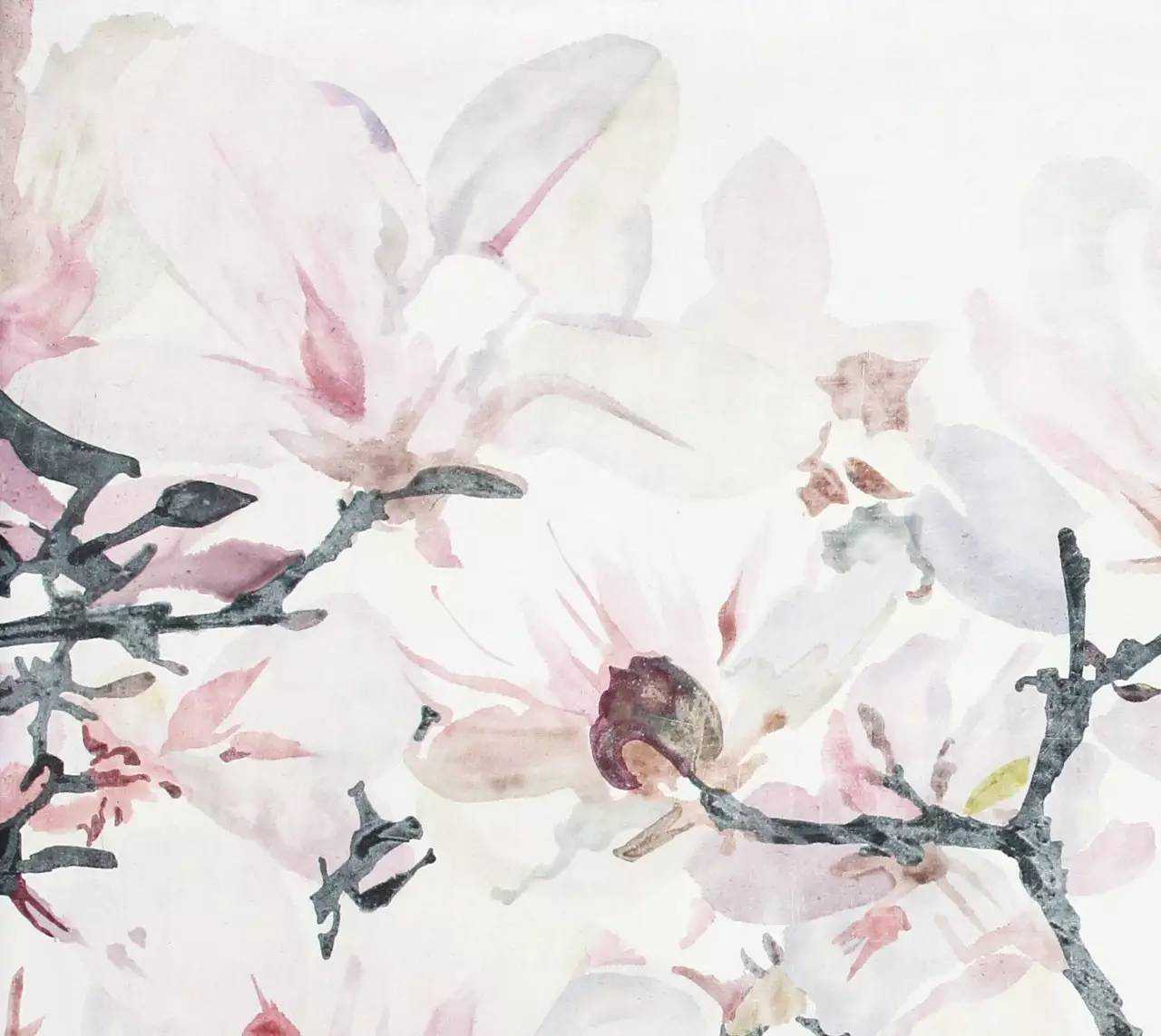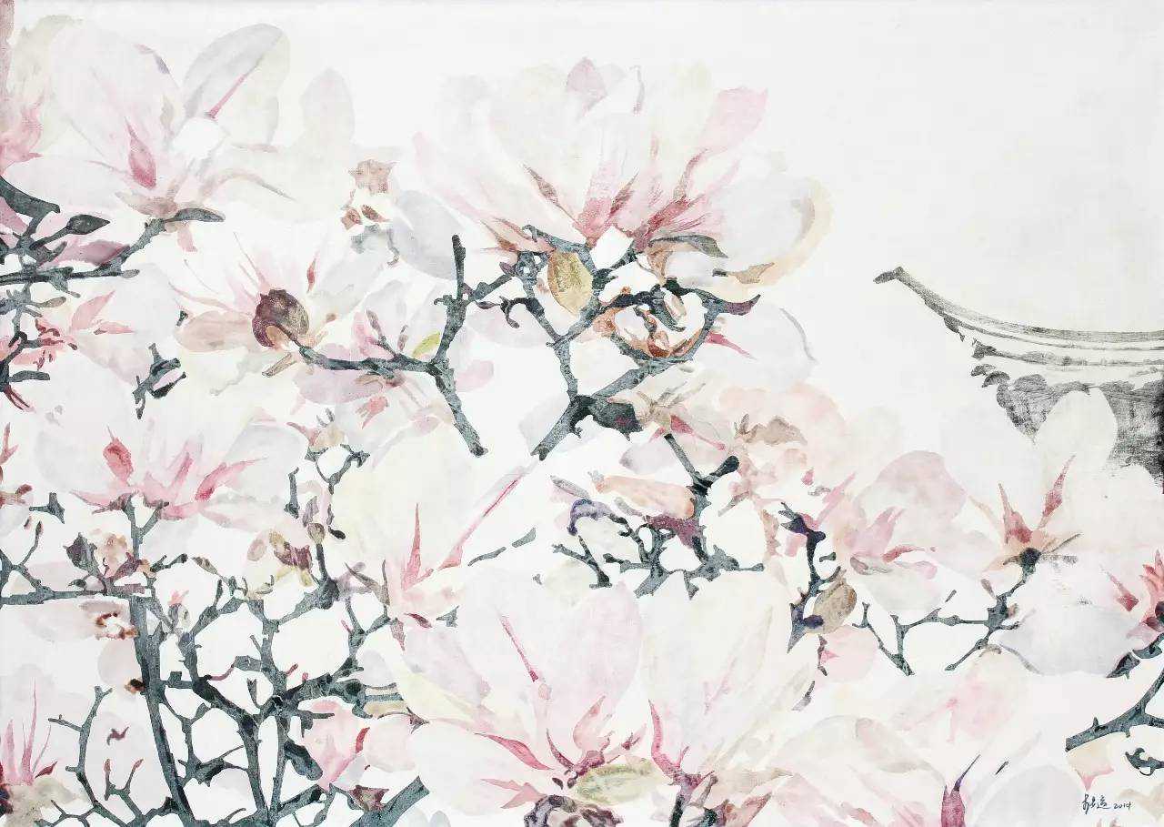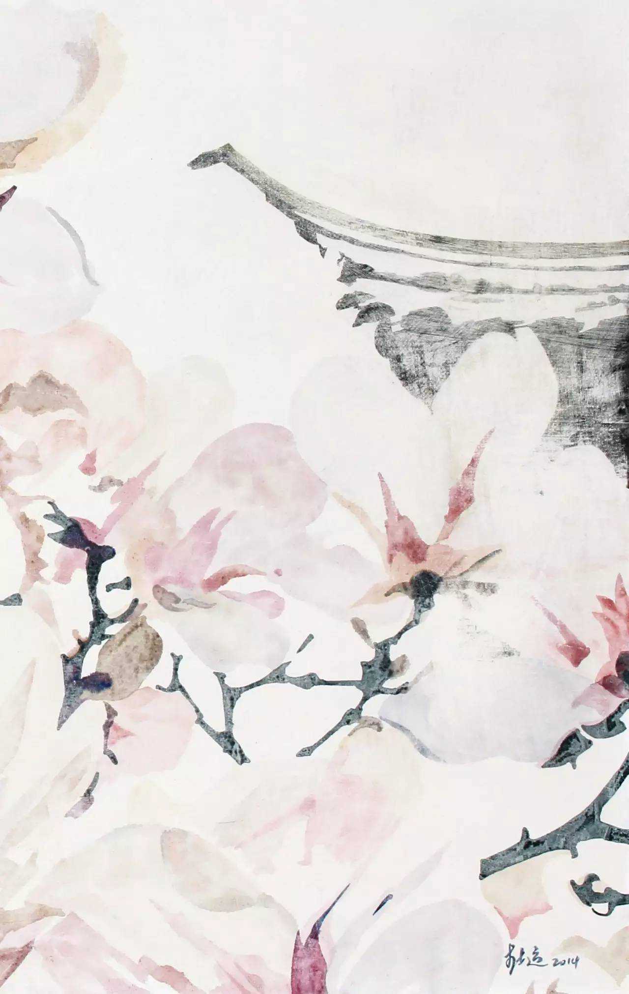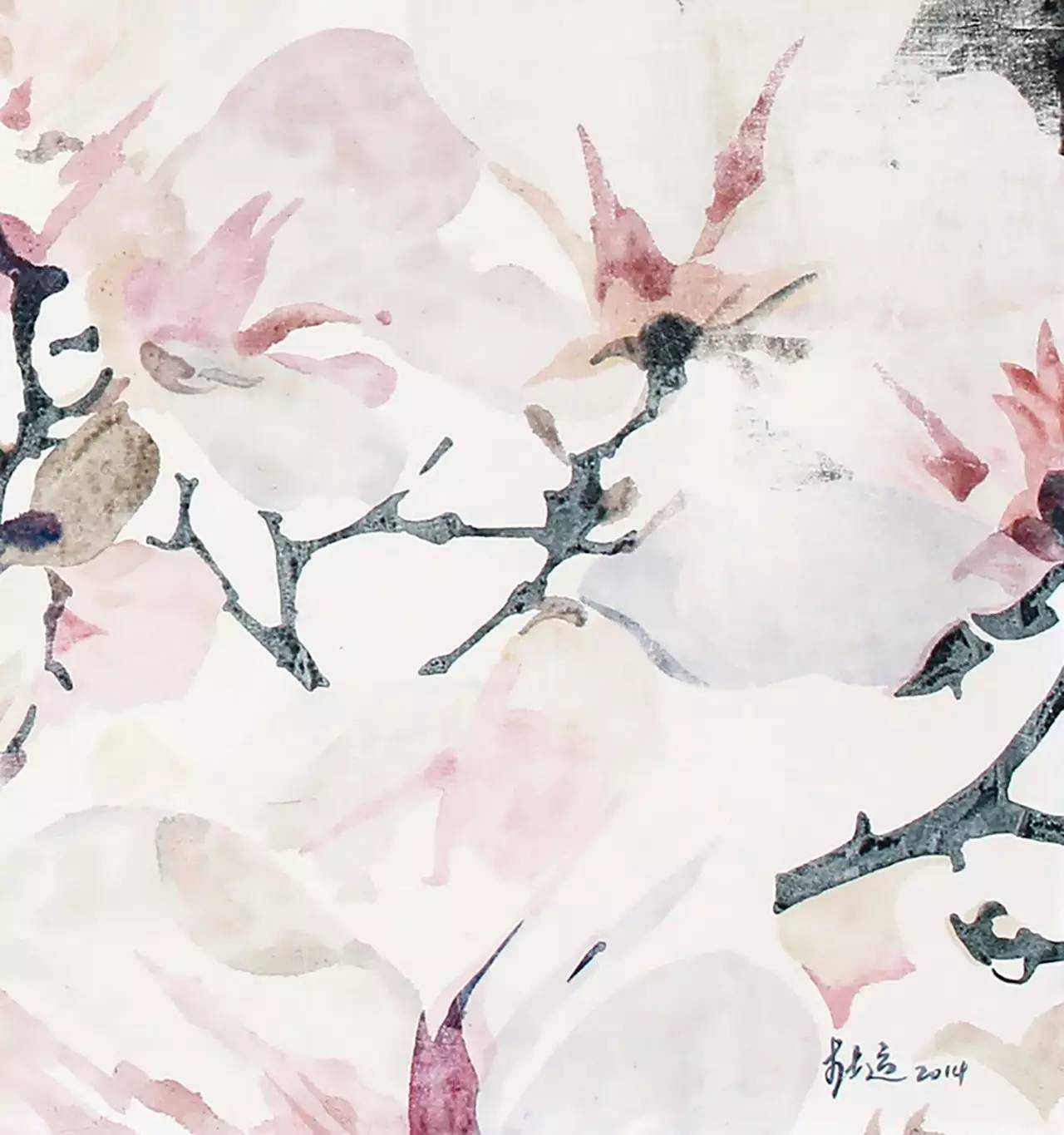 玉兰又名望春,早春的花中玉兰算是格外引人注目的。一树高洁无暇,尤为灿烂。西湖边玉兰一开,就是湖上春风又至的信号了。李士运老师此画中泛着红粉的玉兰开得正盛,春晴之时,隔着渺渺烟波,山色晴峦,有如翠黛,花影之下走走停停的游人一如旧时那般如织如麻。李士运老师画中玉兰用色清淡优雅,给人以无限的遐想与“临场”感。笔致细腻,有新意,也颇具文人气象。