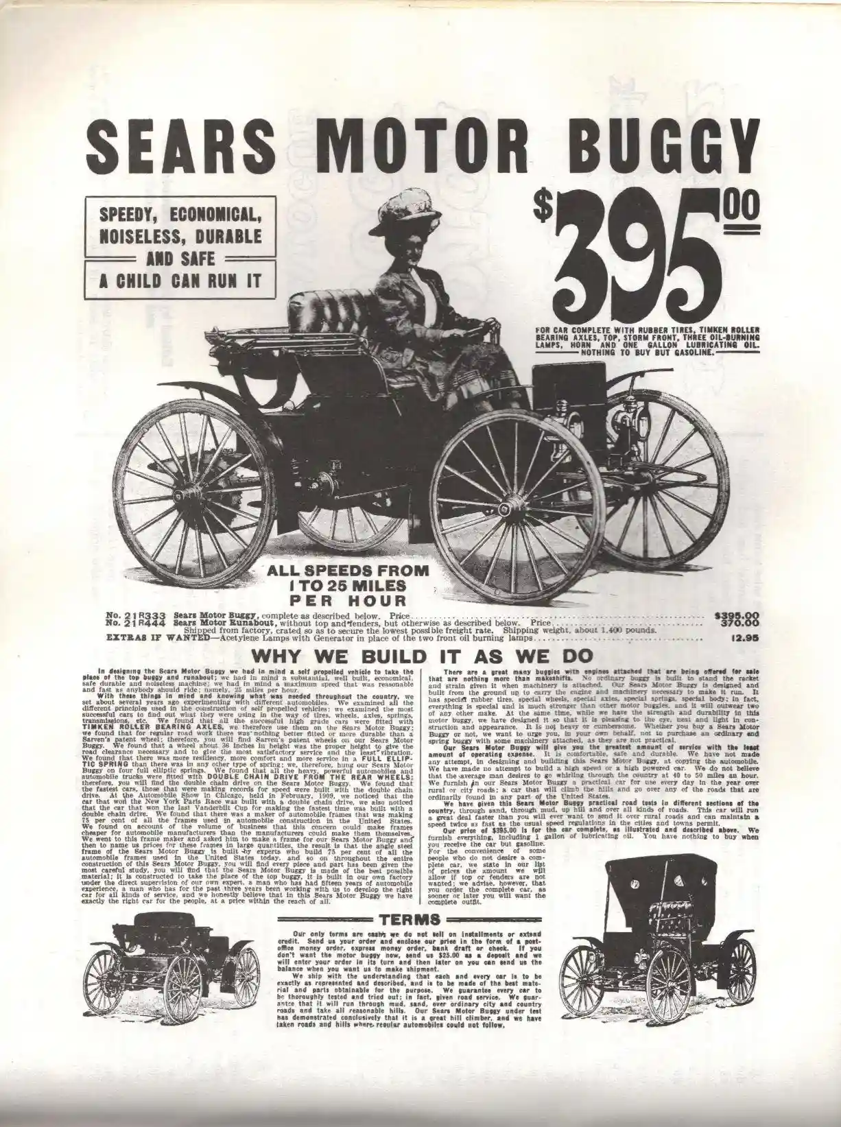 最初,西尔斯公司只提供了一个型号高轮汽车,但到1910年,邮购目录中已经包含了全系列的五种车型。这五种型号的车辆,在基本的配置上几乎没有区别,他们的不同之处就在于一些便利设施的不同,例如:挡泥板,棚顶,灯等等。广告是这么描述的“坚固的角铁框架,椭圆形弹簧减震和四个轮子上的铁姆肯滚子轴承”。动力来自水平对置的双缸发动机,可产生14马力的动力。双链传动通过链轮给大直径木轮提供动力。西尔斯(Sears)能够以每小时25英里的速度前进,并且可以通过向后拉动档把,使得车辆向后运动。