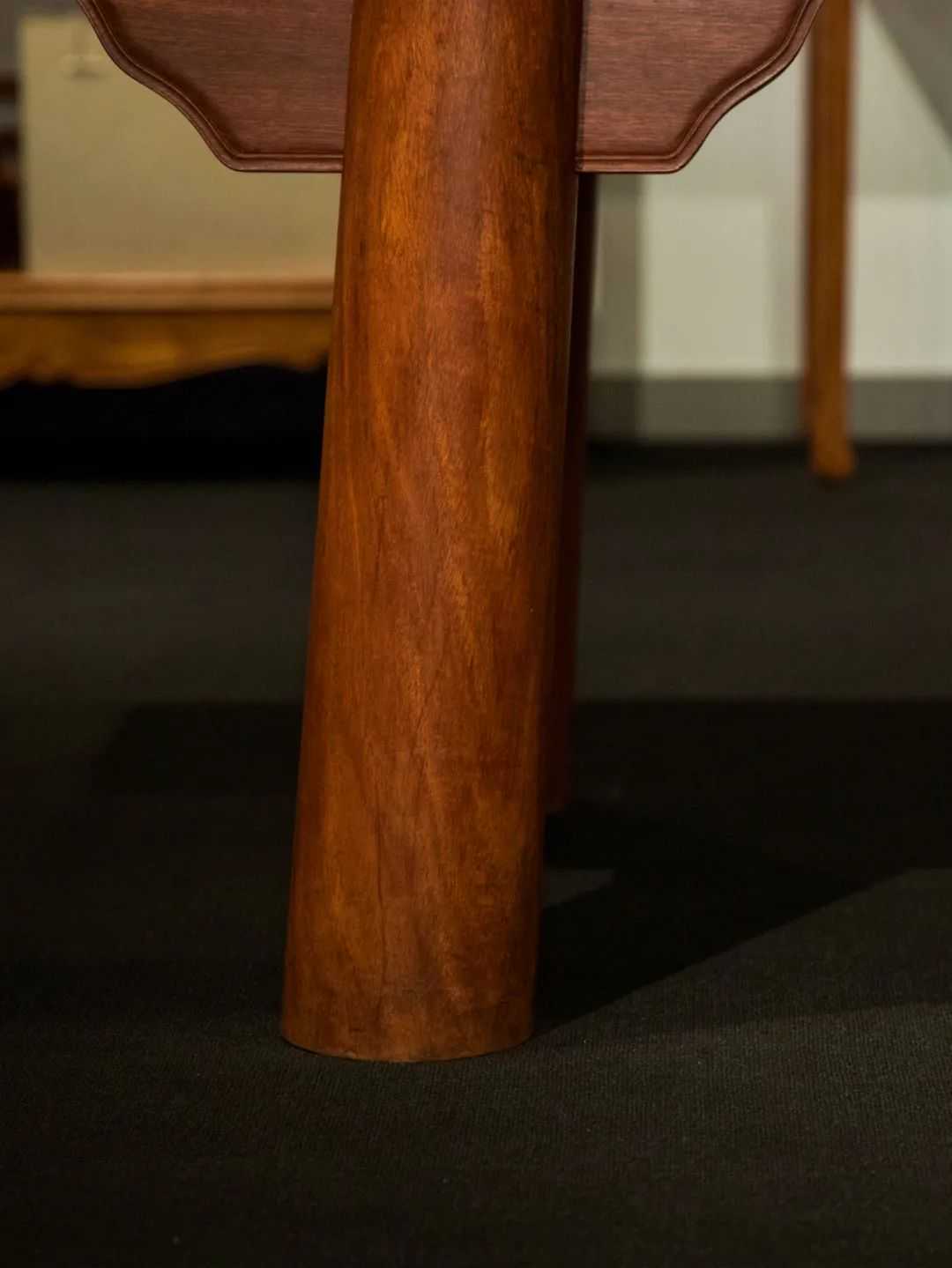 大案作圆足,如大象之腿,壮硕稳健,撑起牙板及案面。气象宽宏,四腿侧脚收分明显,挓度适中。