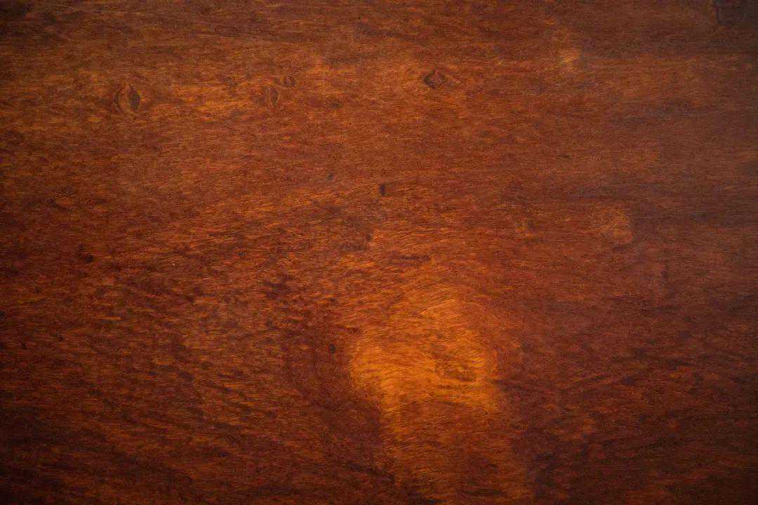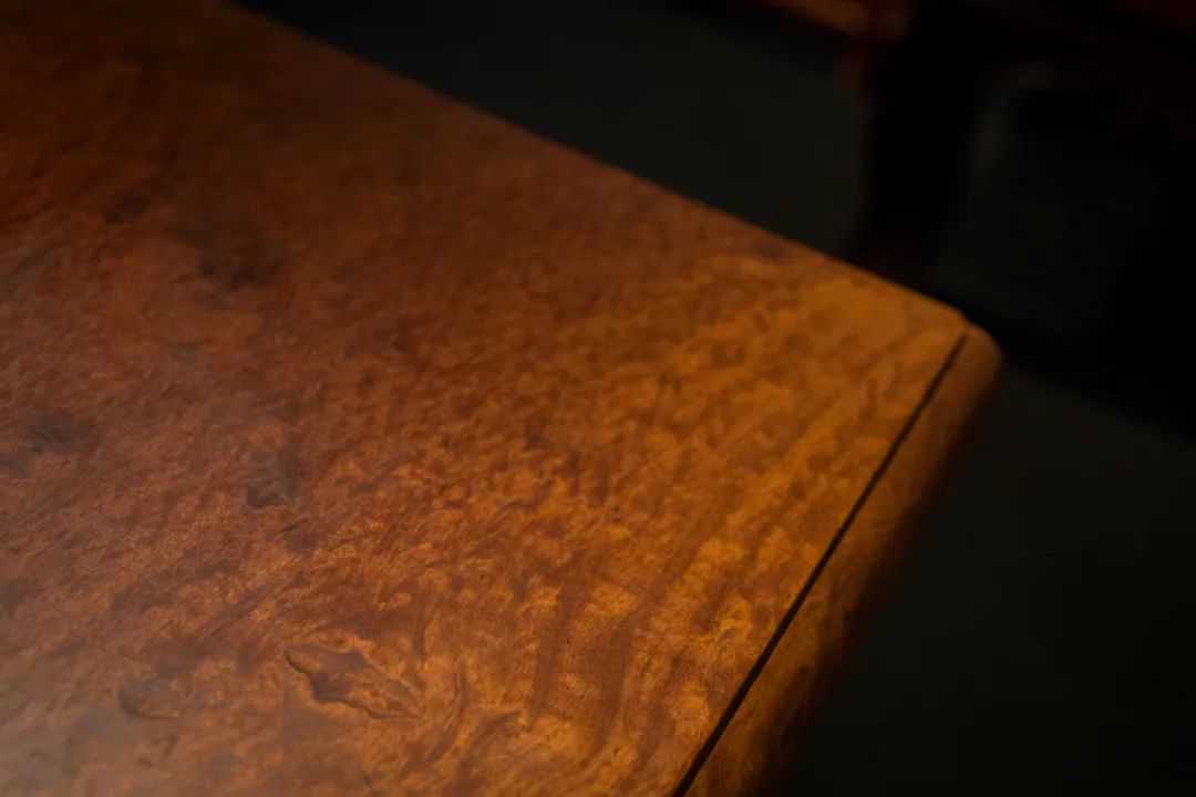 “一块玉”能很好地保留木板面的花纹,绚丽诡谲,给人以无限的文思。此案一块玉面板厚度为7.5cm,边抹做混面压边线,木材花纹从面板一直延续到梗面,似山谷送风,似流水潺潺,似骄阳烈火,似绸缎绵长,移步换景,观来让人欲罢不能。