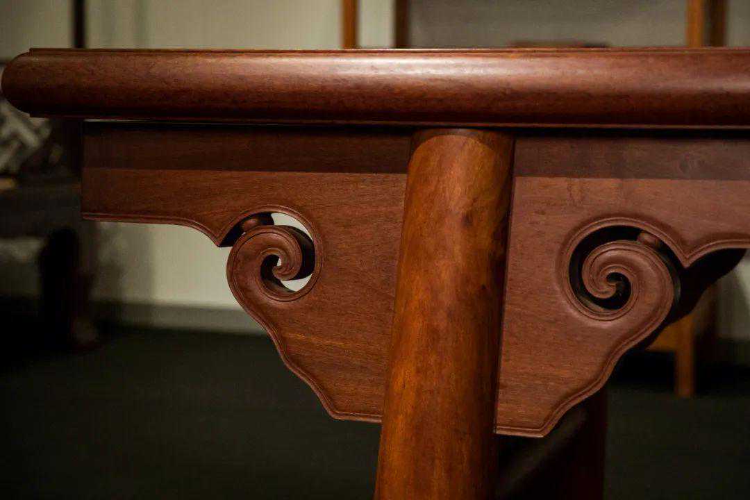除此之外,大案牙板锼挖的如意云纹亦为整块宽厚木板挖出,区别于用榫卯拼接牙头,在力学结构上更加牢固,同时在视觉观感上气势更加宏大通畅。