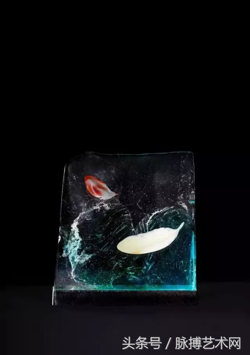 作品用两种不同的材质,做了两片羽毛,白羽毛用的是和田玉,红羽毛用的是玛瑙,嵌在一块彩色琉璃上,在慢慢飘落,又仿佛被时间凝固了。凡尘间芸芸众生的七情六欲有谁能放得下.而又有谁能够达到羽化的境界呢!设计者运用了白玉的素净,玛瑙的鲜艳和琉璃梦幻般的色彩,巧妙地组合在一起,来诠释羽化凡尘的意境。