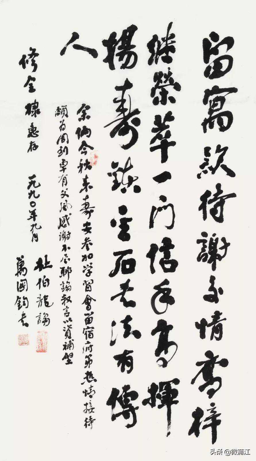 释文:蒲江颂夫蒲江者,古称蒲阳。东赏苏轼之明月,西饮理真之甘露,南聆乐子之为学,北品文君之琼浆。放眼锦城之繁华,抬望岷峨之屏障。三山莽莽翠天地,两河泱泱通海江。鸢飞鱼跃,鹤舞鹭翔。松涛阵阵,果茶飘香。石象湖生态迷人,引领袖注目,长滩湖祥龙戏珠,令游客神往。美哉蒲江。牧野兴师,联军伐纣,为西周之兴盛,奠定鸿基;濮人故乡,勤劳智慧,乃绿色之典范,名播八荒。二魏三高,千秋功在;家钰抗倭,百代颂扬。化工博士杜长明,育英袞袞,文化名人张黎群,世人敬仰。伟哉蒲江。金釜井煮盐,惠及西南。惠民监铸钱,名传中原。战国船棺,业界为之震惊,巴蜀图语,谁能解其秘传?飞仙阁仙境,云蒸霞蔚,河沙寺壁画,天府奇观;明月窑享誉海外,蛮塔子屹立千年;杂柑、丑柑、猕猴桃、潘沟茶,誉满神州;蒲席、蒲砚、豆腐乳、米花糖,饮誉九天。壮哉蒲江。夺全国绿色发展之先声,创天府旅游文化之辉煌。看今日之蒲江,千帆竞发,騏骥腾骧。鹤山书院,书声琅琅;了翁理学,文脉悠长。产业城,卓立荟胜势,开发区,集群聚客商。成雅高速,纵贯全境,造福桑梓;川藏铁路,国之方略,蓉藏津梁。建设新型社区,村民尔弦我唱;保护生态环境,水天鲤跃鹭翔。世人曰,上有天堂,下有苏杭。余有言,天然氧吧,当属梓乡。强哉蒲江。嗟乎:千古蒲阳是吾乡,人杰地灵育贤良。三山有韵吟诗美,二水无私奉志强。秋山不墨千秋画,蒲水无弦万古腔。欣逢盛世百业旺,续写鸿篇谱华章。