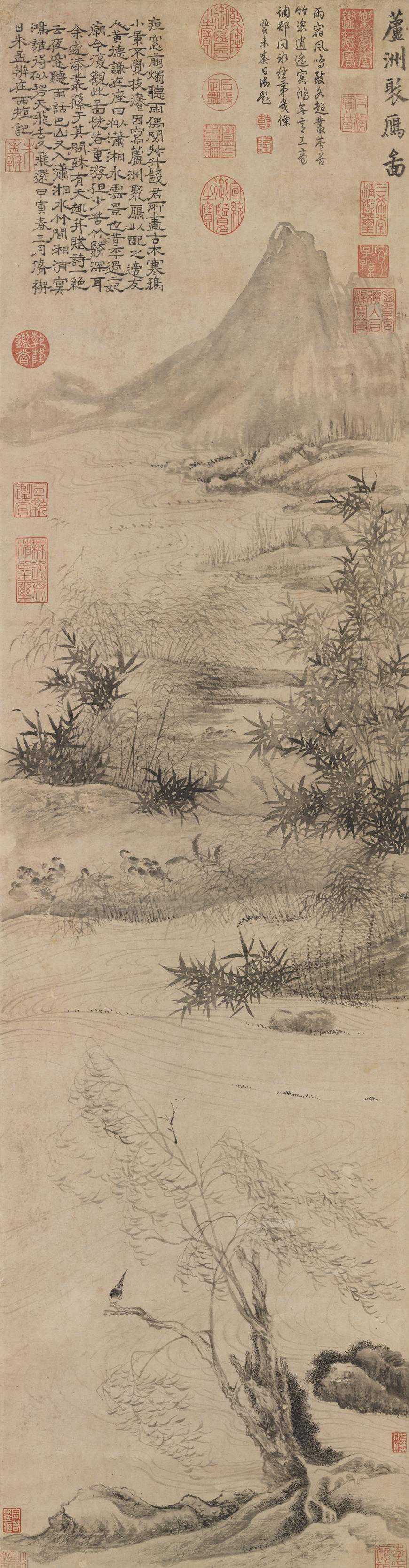 本幅画潦水沙洲,枯柳岩石,群雁聚息芦丛情景,前人评为极得潇湘烟水之致。又据自题称,芦洲聚雁先画成,竹丛题跋系数年后所添加,是知亦为其自许之作品。