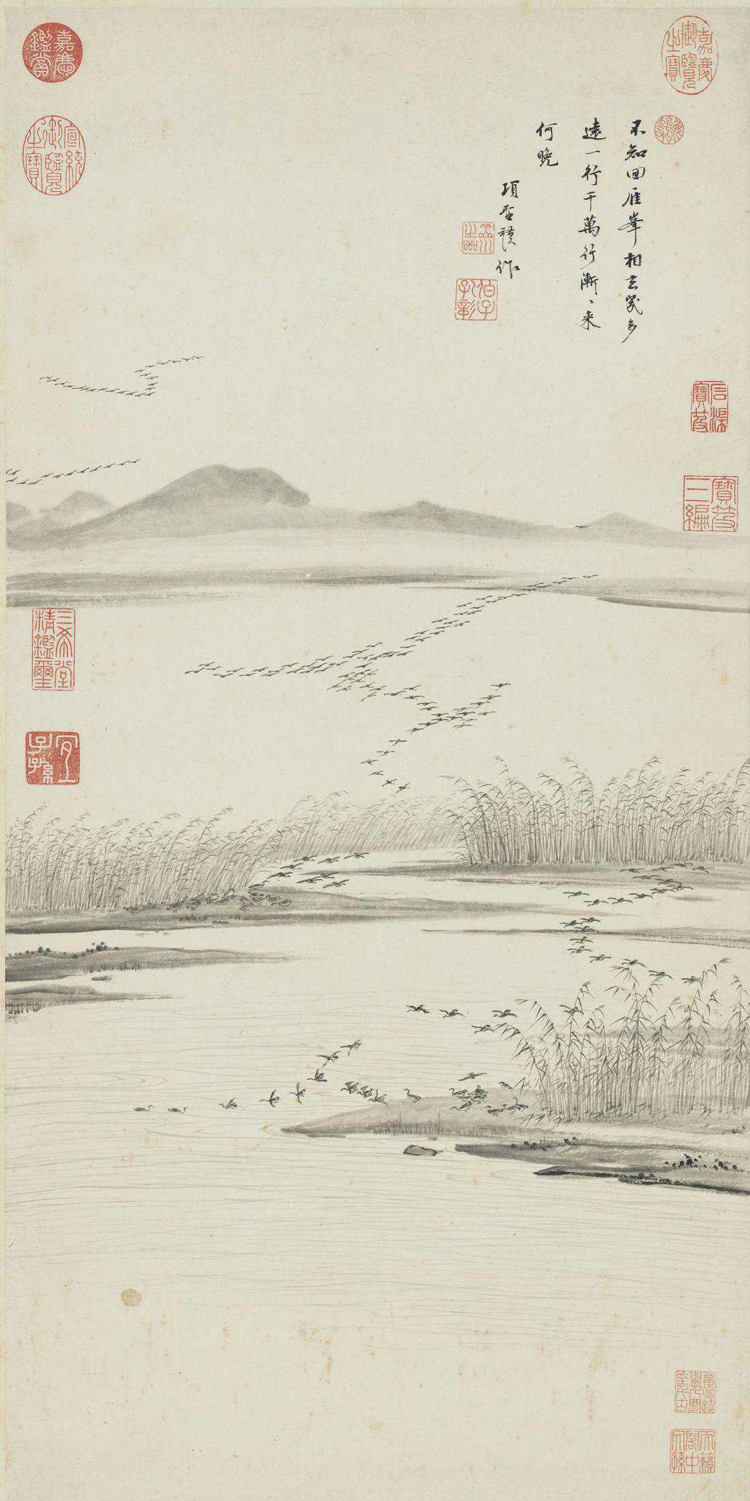 项圣谟(1597—1658)为元汴之孙。字孔彰,号易庵,又号胥樵。工书画山水,初学文衡山,扩于宋而取韵于元,乃项氏家族数代以来画名最高者。此幅写丛汀芦苇,群雁就宿,或低翔而下,或结阵远来。于江天空旷之中,写霜秋暮景,使人观之,若有萧瑟凛冽之气,可谓善画者以意胜也。鉴藏印记中有方“天籁阁中文孙”,足见其景仰祖父元汴之情。