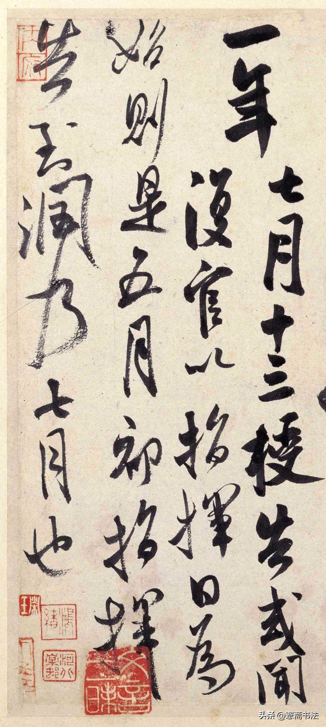 这件作品的另一个值得赞叹之处是米芾对古人的融会贯通。米芾对于前人如"二王"、颜真卿、李邕等的法帖到了如醉如痴甚至为了据为己有而不择手段的地步。他在传统上下过很大的工夫,有时临摹原帖可以毫厘不爽、几可乱真。《宋史》上称他"妙于翰墨,沉着飞翥,得王献之笔意;尤工临移,至乱真,不可辨"。正因为他功力深厚,在创作过程中就可以如鱼得水,左右逢源。米芾并不是一味地摹仿前人,而是依靠自己的功力和对传统的理解自然流露,从而达到天衣无缝、浑然天成的艺术效果。"集古终能自成家",米芾的成功给予后人的启示也就在于此。如果想在书法上有所收获,最直接、最有效的办法就是深入传统、遍临百家、博采众长。这样似乎看起来是比较慢也比较笨的途径,但实际上,慢往往意味着快,笨也往往意味着巧。