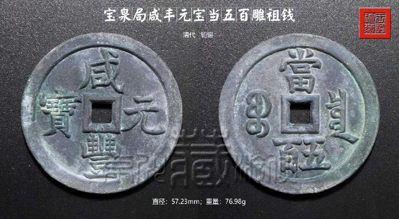清咸丰年间,中央和地方官钱局纷纷开铸五十、百、千大面值钱币。因此,这期间采用铅锡快速做成雕祖钱或者样钱也成为一种似乎必然的选择。马定祥先生在其《咸丰泉汇》一书中曰:“……内有宝泉、宝源铅样全套,精美无比,惜钱拓在‘文革’期间散失,祖钱中与定式互异者,乃未经入选之品,更为珍稀”之说。这说明,在咸丰年间至少他已见宝泉局铅质祖钱或样钱。