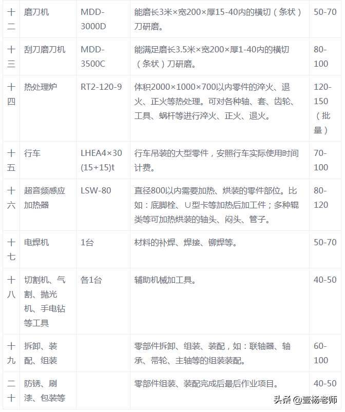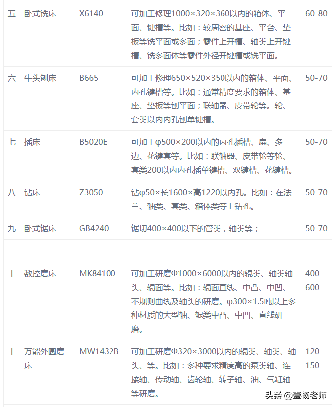 主要使用于小批量、零件返修、重量较轻、不利于移动等零件加工的零件计价。根据机加工种类:车床、铣床、钻床、数控加工、磨床等进行分别计价,具体如下表: