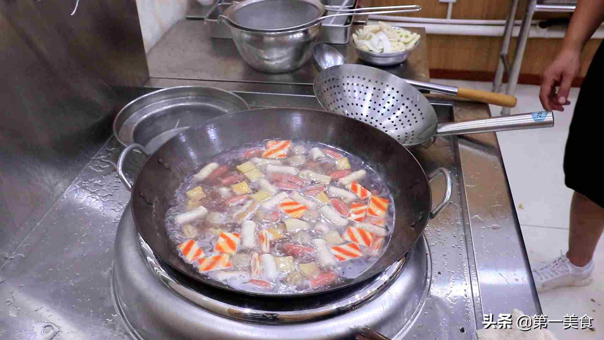 趁着这个时间,我们准备其他配菜,吃麻辣香锅肯定少不了丸子,蟹排、鱼豆腐、鱼丸、牛肉丸,小香肠,这些在超市很容易就能买到,选自己喜欢吃的多准备一些,蟹排比较大我们把它切一下,豆腐皮切成宽条,挽上结和丸子放在一起。