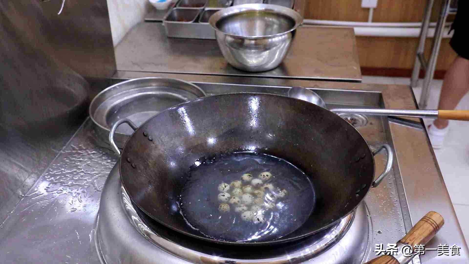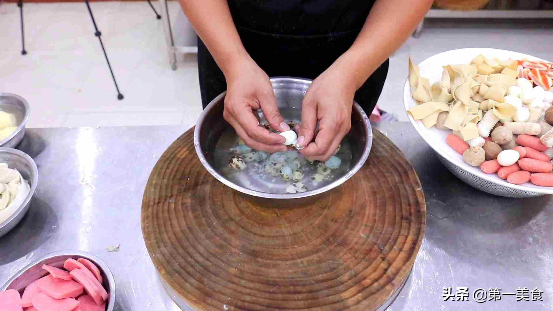 2.这个时候,鹌鹑蛋也煮熟了,我们把它捞出来过一下凉水,煮熟的鹌鹑蛋很容易就能转起来,鹌鹑蛋晾凉以后,把外壳剥干净备用。