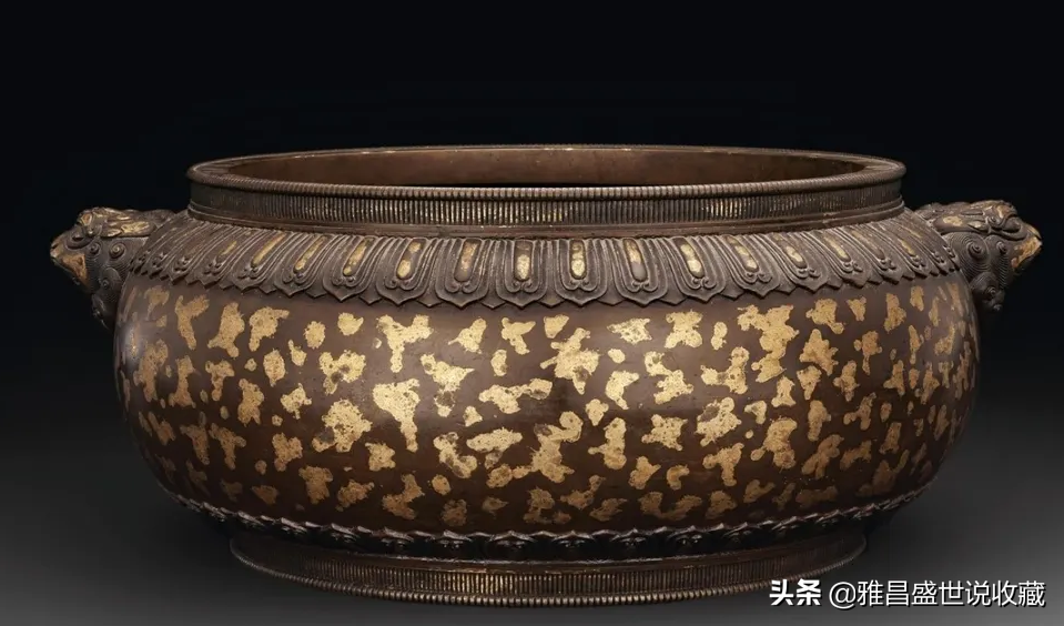 1:清乾隆铜洒金狮耳炉,尺寸:宽39厘米,估价:RMB4,000,000~6,000,000,成交价:RMB4,600,000,成交时间:2011-11-15该器为直口,短直颈,圆鼓腹,圈足,线条圆弧流畅,造型典雅端庄。口沿和颈部饰竖条纹,肩部饰一周覆莲纹。两侧缀饰对称的高浮雕狮首,纹饰狰狞威武,毛发细密卷曲,呈螺髻状,丝丝清晰可见,层次分明有序,额头隆起,双眉宽厚,作卷云状弓形,双目圆睁,神采奕奕,桃形凸鼻下有一张大口,露齿,两颗锋利的獠牙凸现。狮自古以来即为纳吉,彰显权贵之瑞兽。下腹部近底处饰一周仰莲纹,与肩部纹饰相呼应。底心方框内铸阳文“宣德二年周义为修篁主人制”篆书款识,竖行,每行三字,字体端正工整,字地平整色暗,“德”字中央少一横,铭款浇铸匀净清晰。器表原本色呈赤霞红,因屡有焚香受用,今呈藏经纸色。周身布满雪花纷飞般的鎏金飞雪斑,疏密分布,错落有致,发出绚丽夺目的红霞金星色泽,彰显出华贵非凡之气。铜质精良,打磨光润圆滑,器壁薄厚适中。该器是难得一见的文人几案间焚香清赏所用香具中的珍品。焚香于内,余香绕梁,可凭添高雅之气。据《宣德彝器图谱》的记载,狮耳炉是仿自哥窑狮首大彝炉款式而制,以赐五军都督府之用,造型典雅稳重,后世多有仿制。