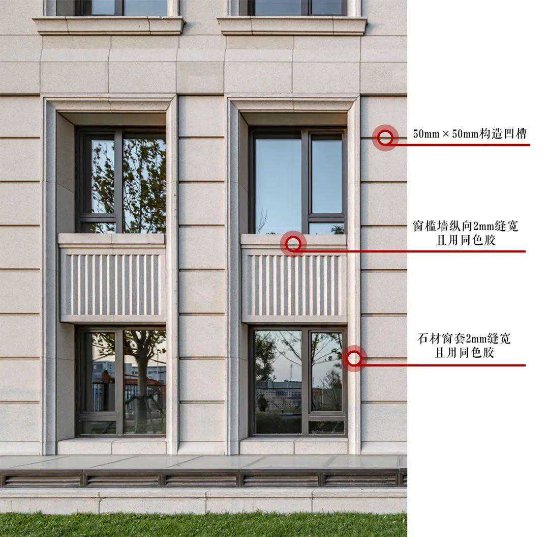 石材联结的缝宽小于常规施工规制,窄缝让建筑浑然一体,石材大面位置6mm宽缝,石材窗套位置2mm窄缝且采用同色胶,重要位置则用闭缝拼接处理。