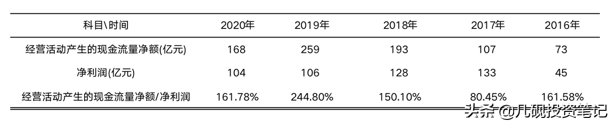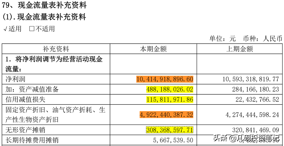 我们去看现金流量表的补充资料,用间接法将净利润调节为经营活动的现金流,就会发现答案。2020年资产减值、折旧、摊销费用加总起来将近60亿。因此,万华化学公司折旧、摊销的金额比较大。折旧和摊销进入成本和费用(主营业务成本、销售费用、管理费用等)从而引起净利润的减少,导致净利润差,但是折旧和摊销是不会减少经营活动的现金流的,一是折旧和摊销是非付现成本,没有现金的流出,二是折旧和摊销对应的资产产生的支出是在投资活动的购建固定资产、无形资产和其他长期资产中体现,不会影响经营活动的现金流。