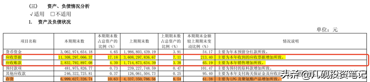我们分别去分析应收票据和应收账款的增加金额,应收票据增加了77亿,应收账款增加了11亿。因此增加的应收总体风险不大。