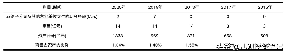 如果一家公司对外投资的是不同行业的公司,而且金额很大,那风险就更大啦。当我们发现一家公司取得子公司及其他营业单位支付的现金净额较大时,我们需要看一下合并资产负债表中的商誉科目如果商誉科目占总资产的比率。如果商誉科目占总资产的比率大于5%,那么这家公司因对外投资产生的风险也比较大。