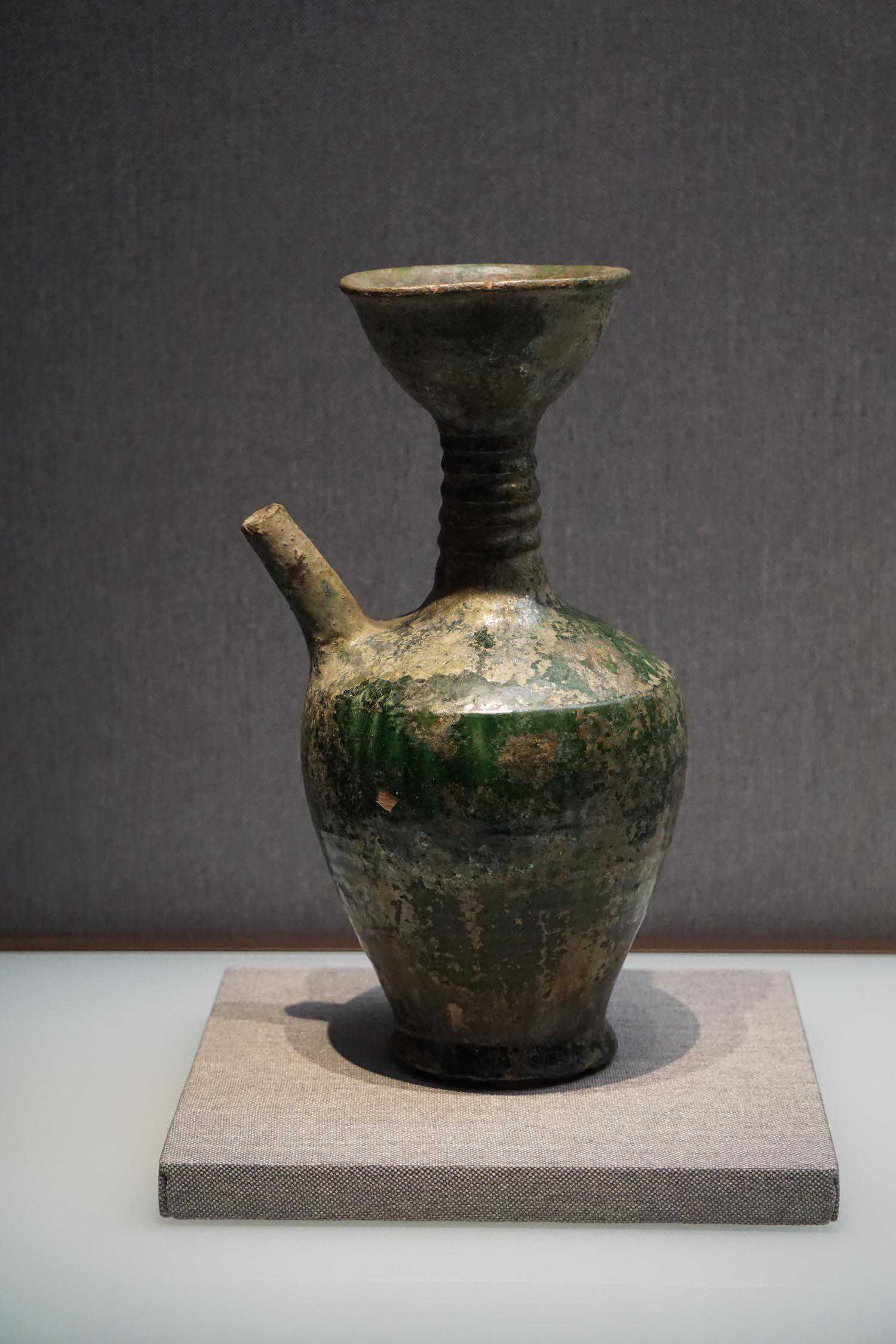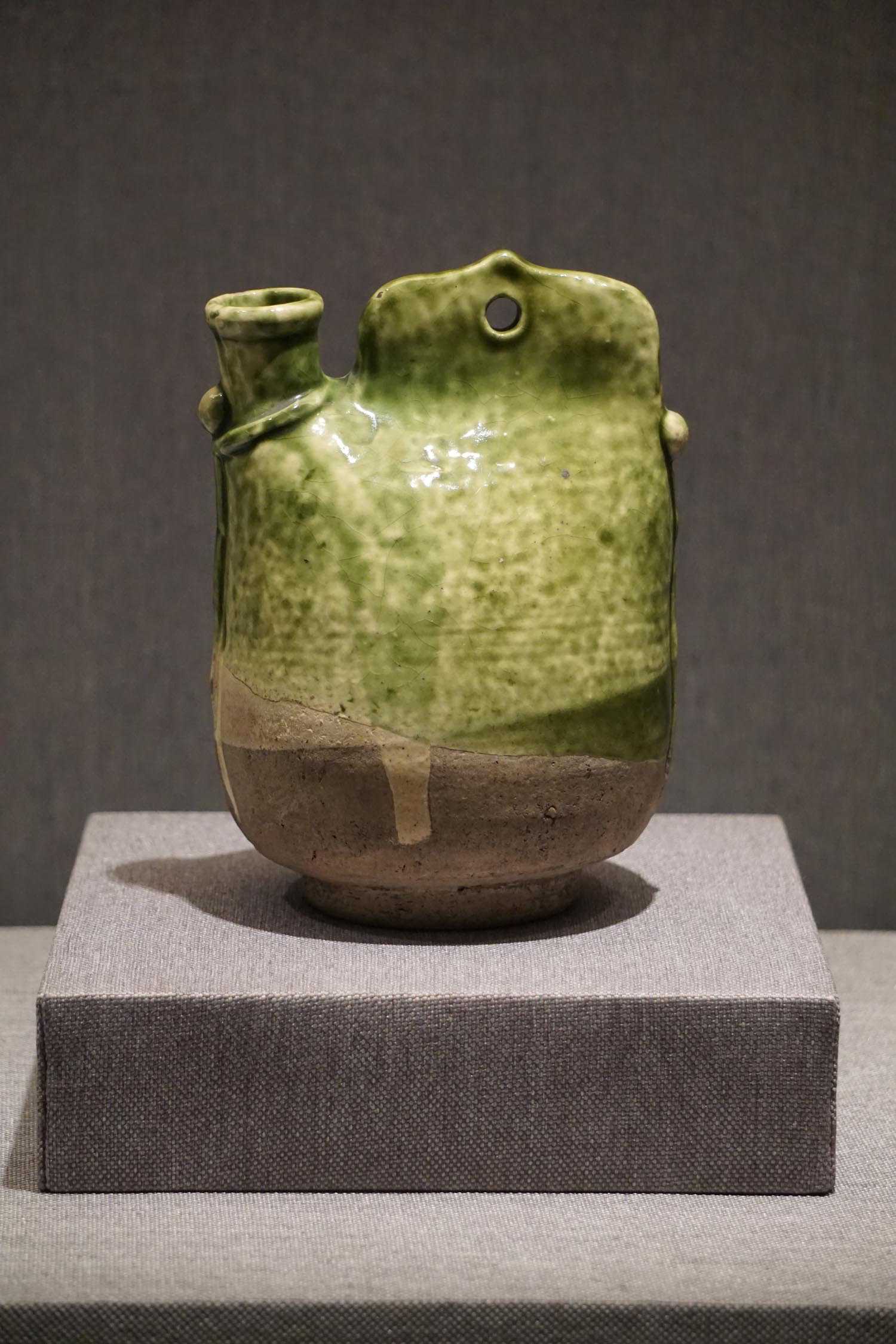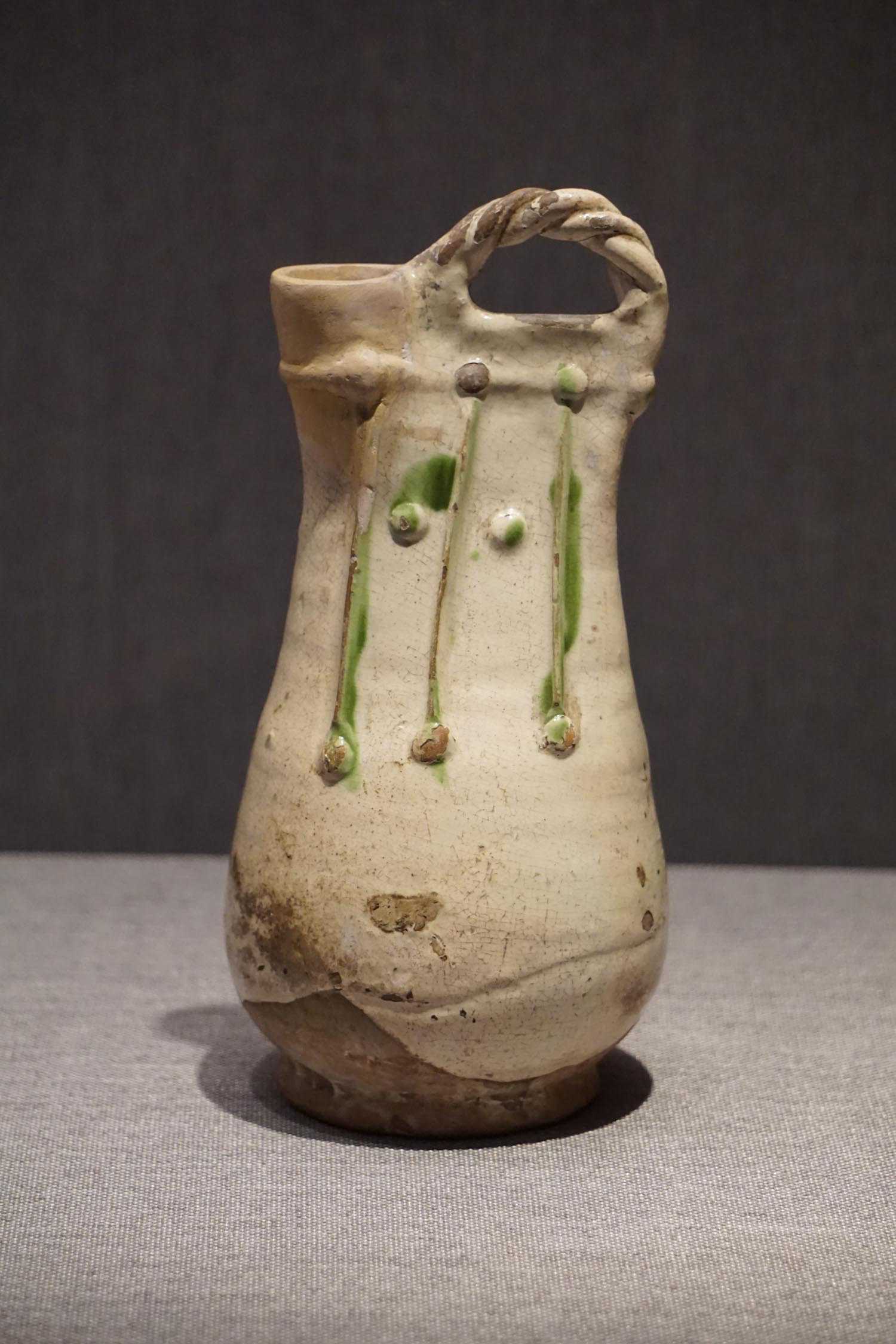 绿釉贴皮条装饰绳梁鸡冠壶