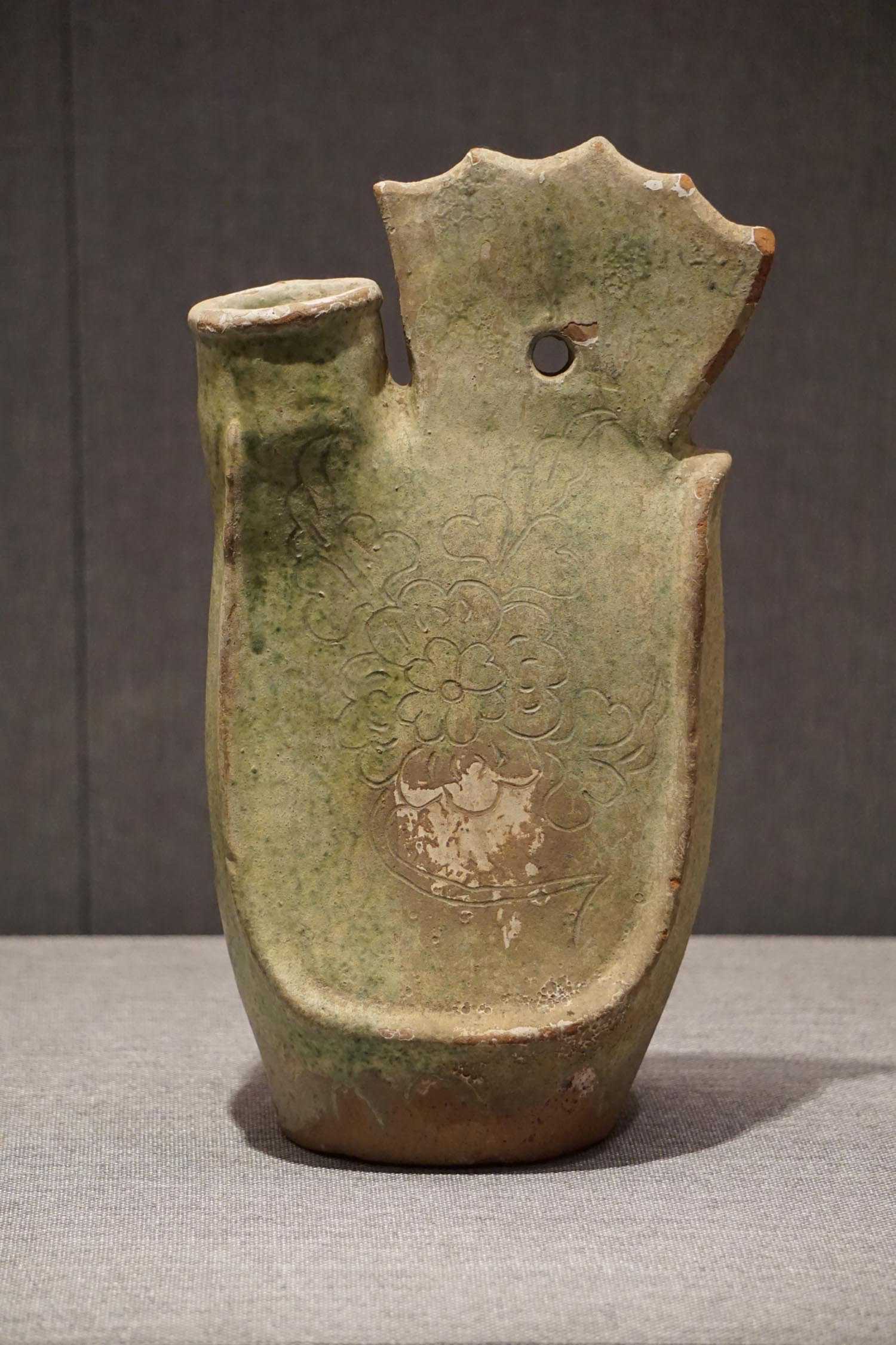 绿釉划牡丹纹单孔鸡冠壶辽