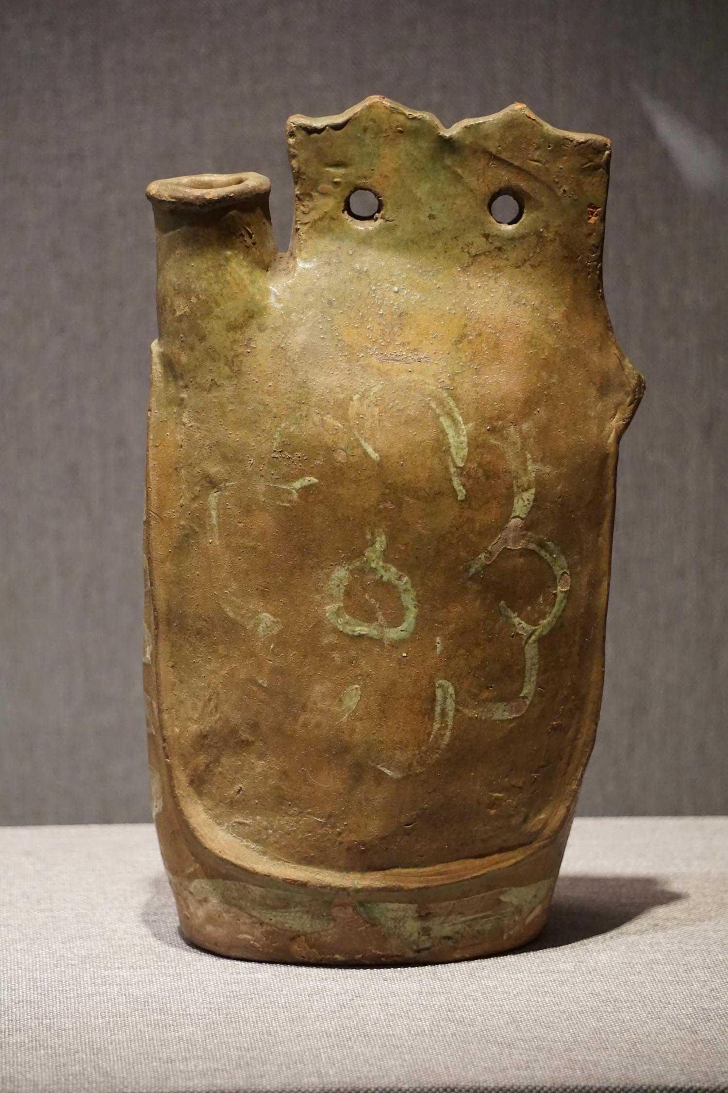 绿釉画花双孔鸡冠壶辽