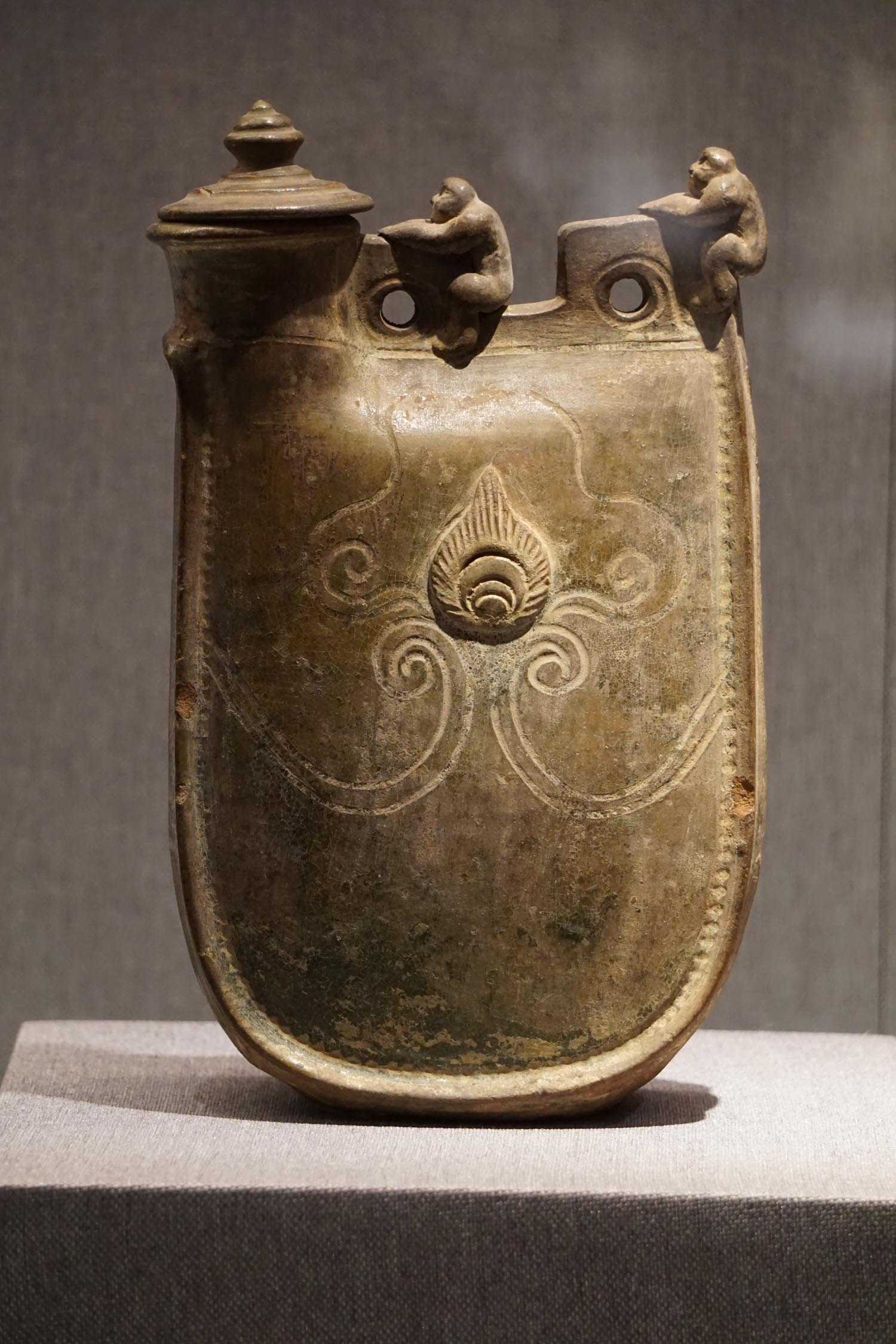 绿釉贴盘龙菊花流云纹双孔鸡冠壶辽