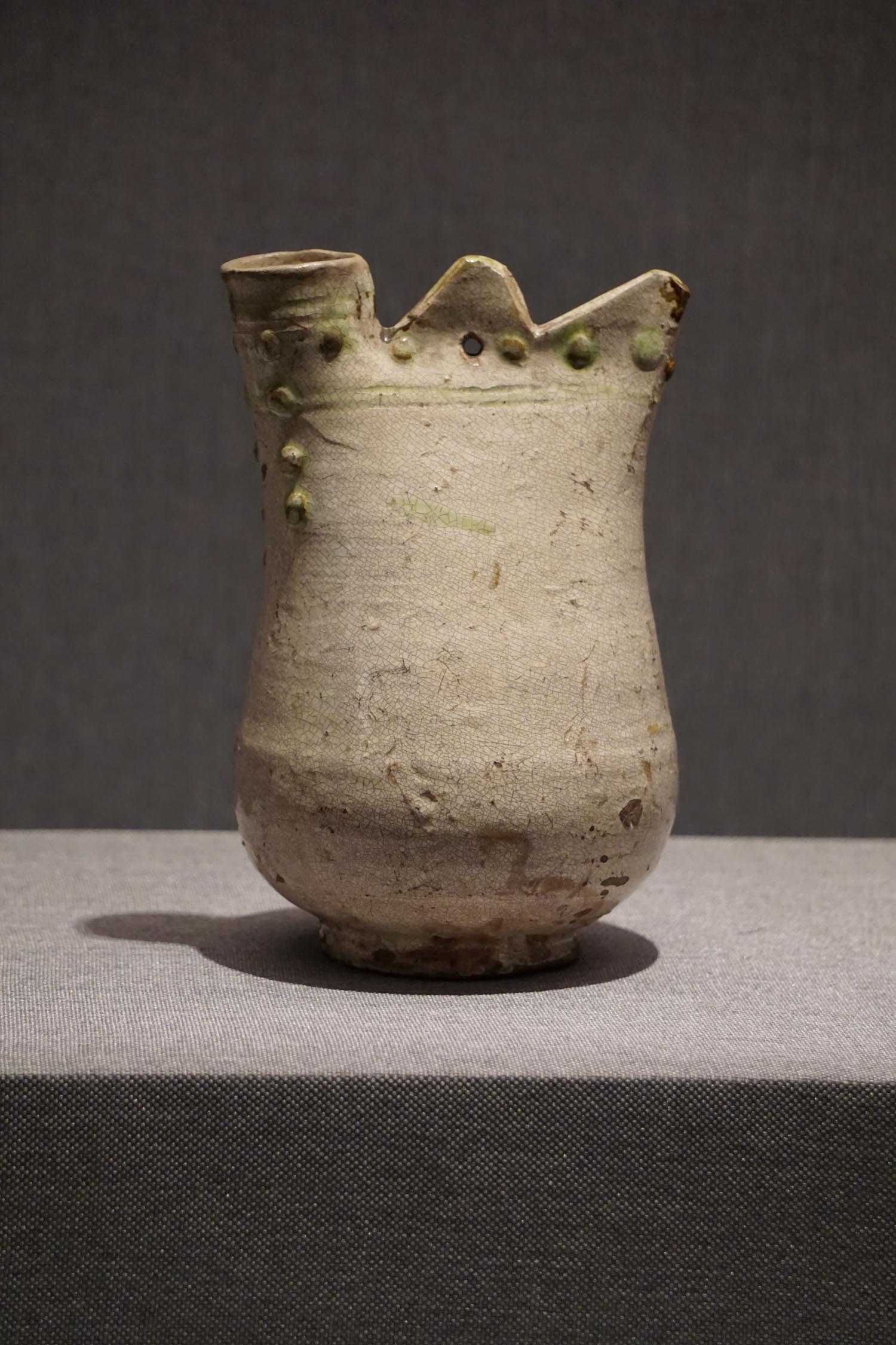 白釉绿彩皮扣装饰单孔鸡冠壶辽