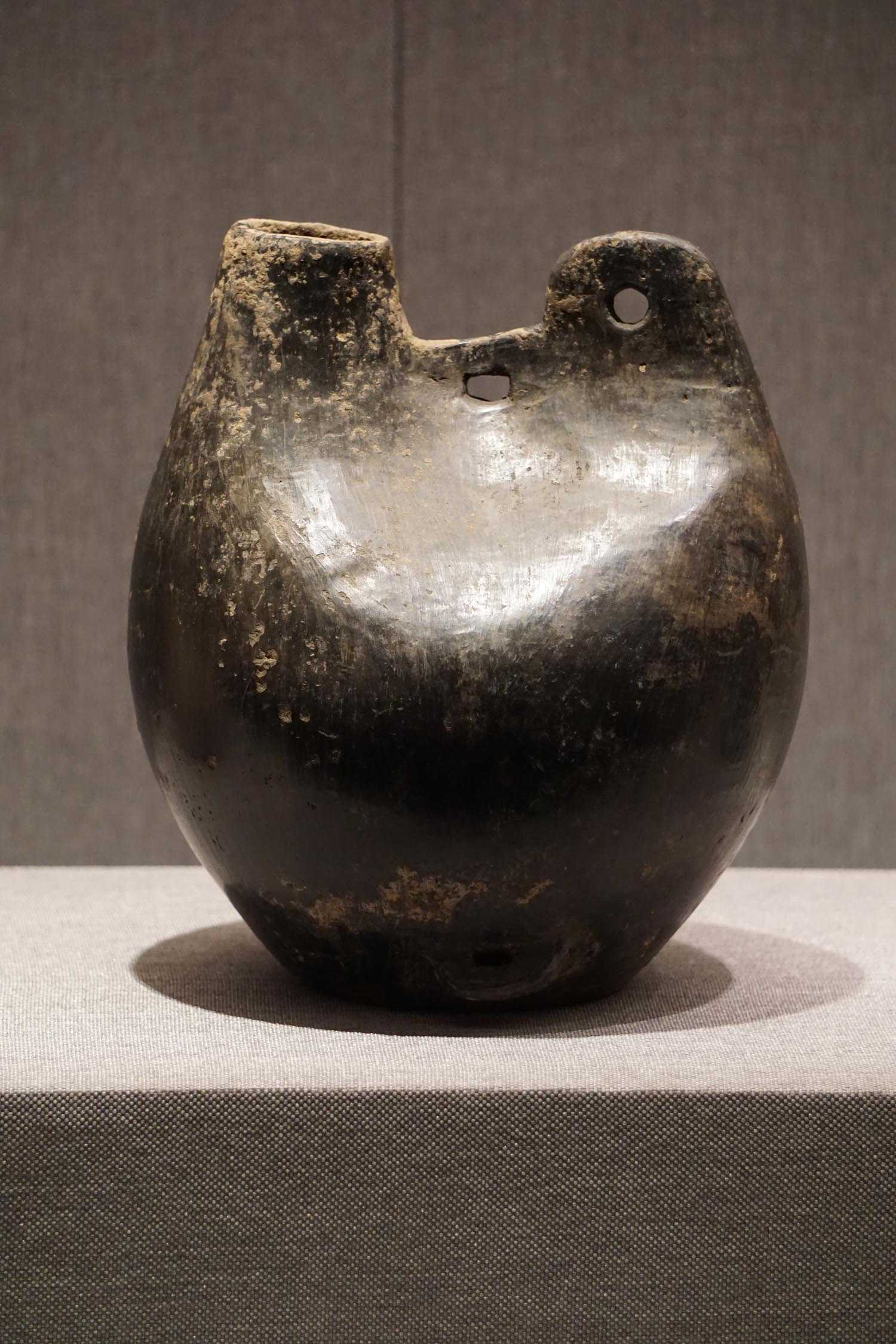 黑陶双穿双孔鸡冠壶
