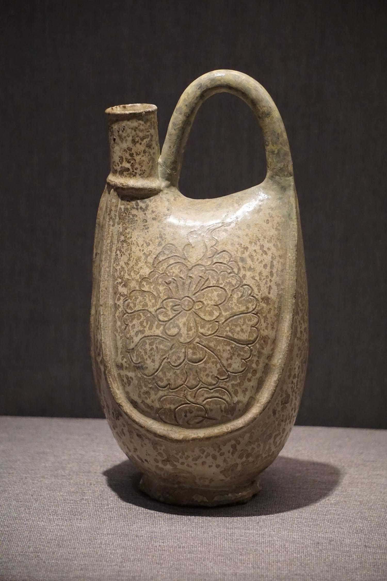白釉雕牡丹纹提梁鸡冠壶辽