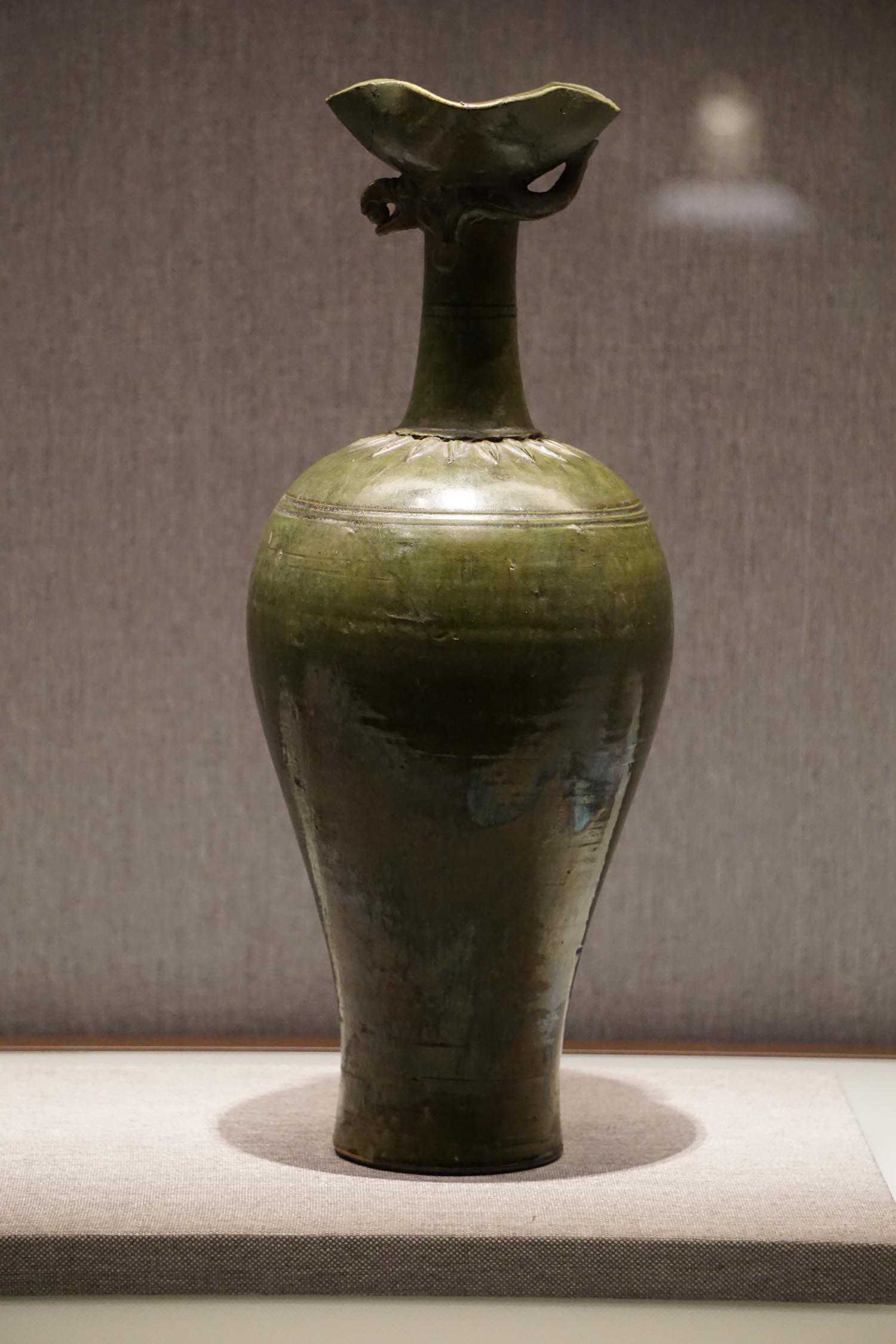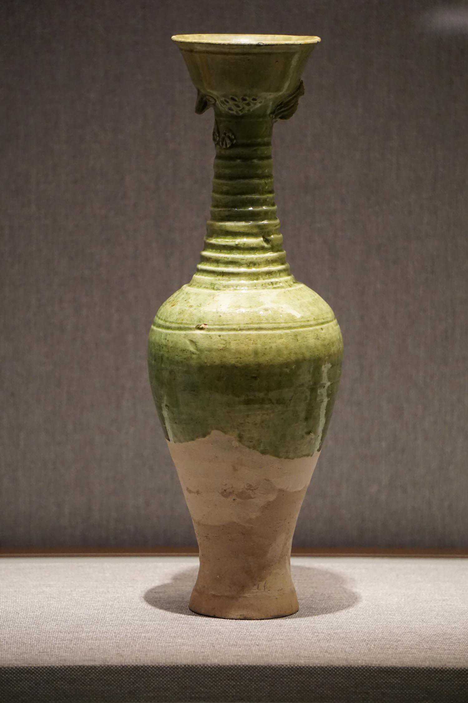 绿釉划弦纹凤首瓶辽