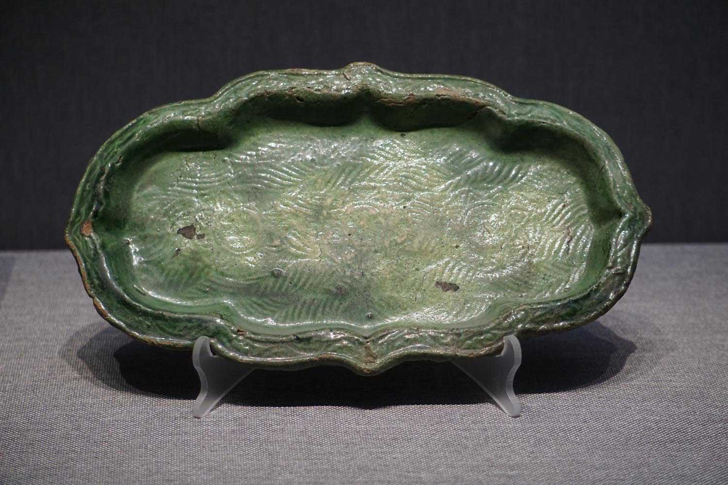绿釉印水波三花纹海棠盘辽