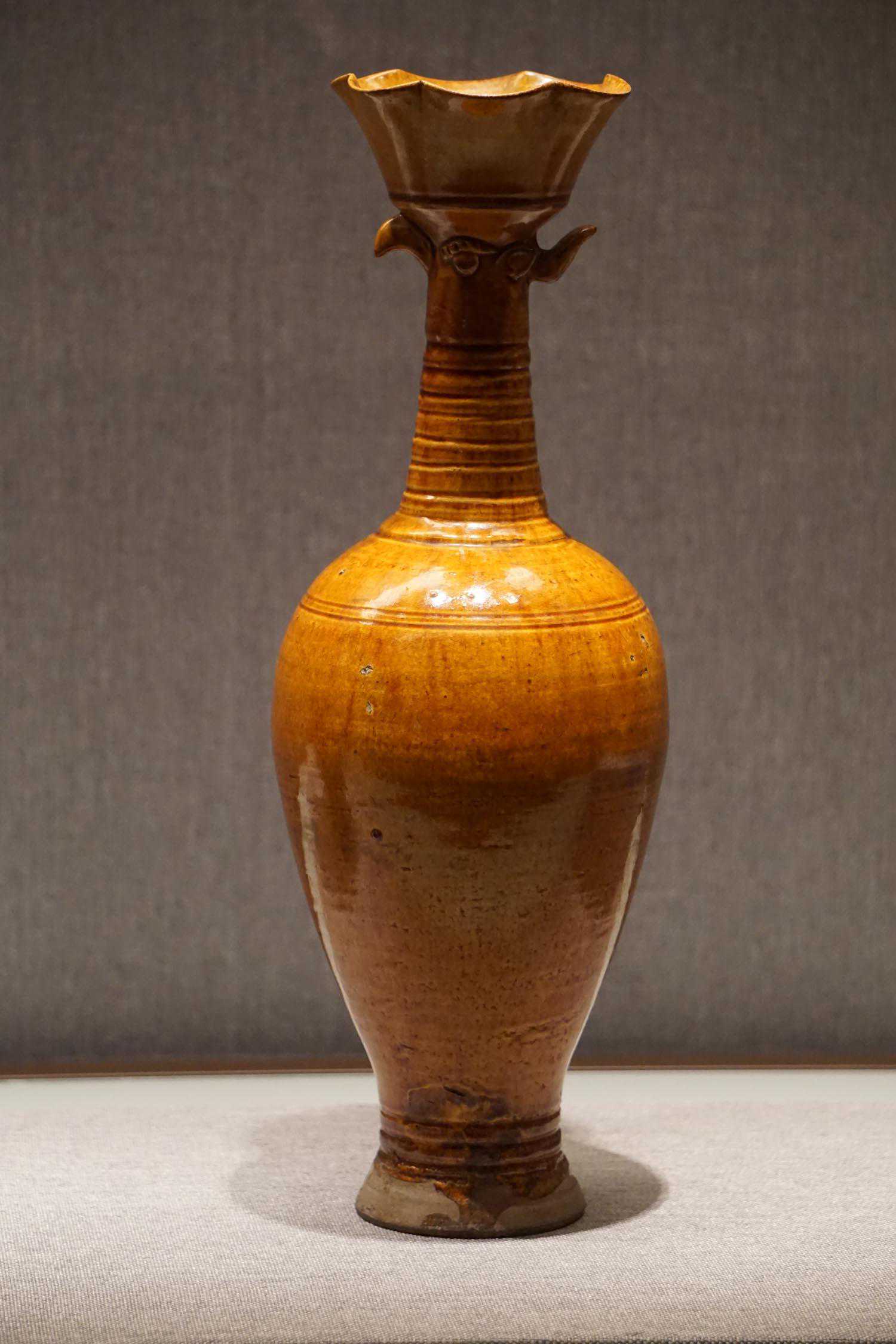 黄釉划弦纹凤首瓶辽
