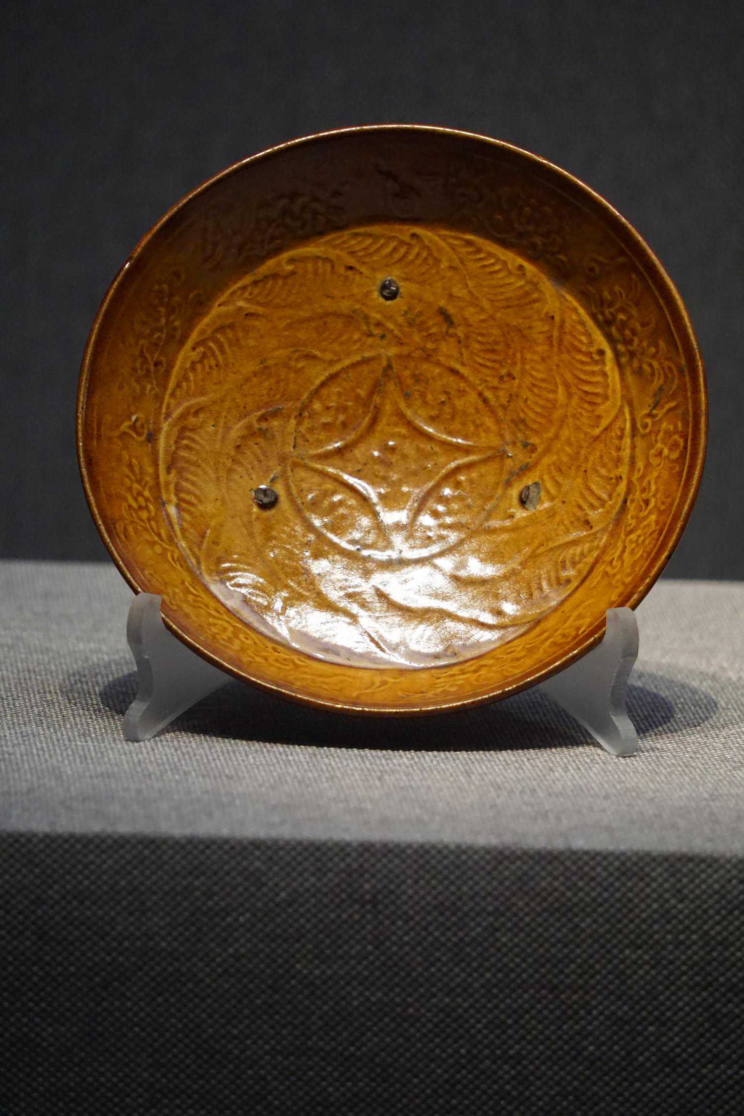 三彩釉印水波三花纹海棠盘辽