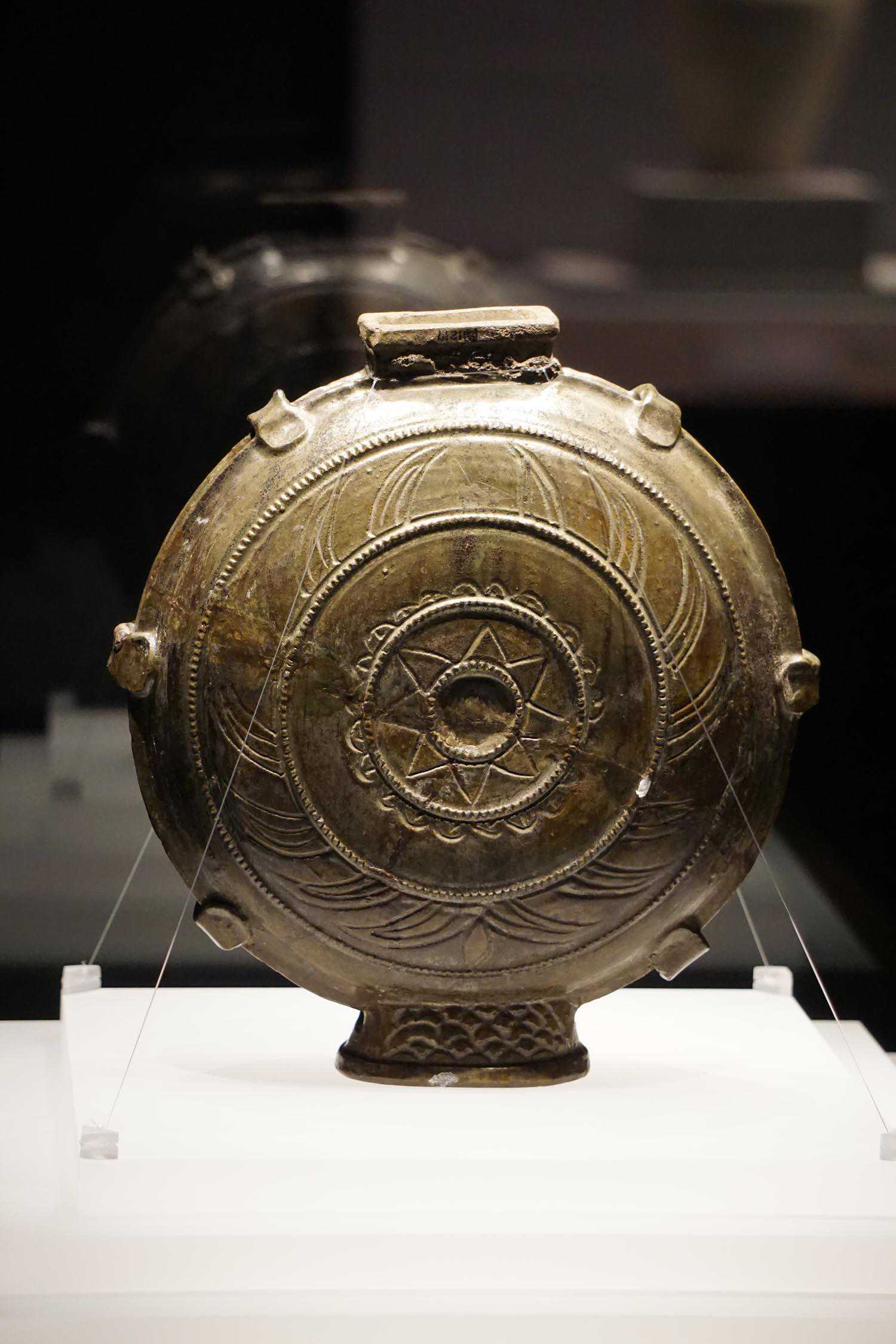 鳝鱼黄釉雕几何纹穿带扁壶辽