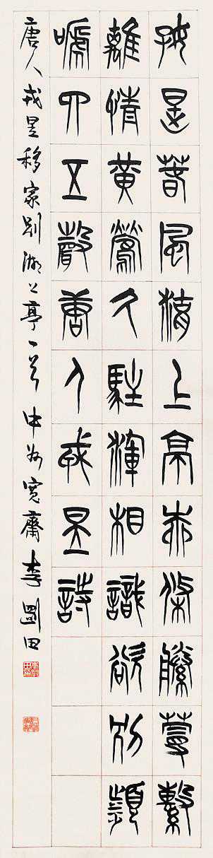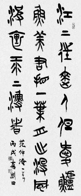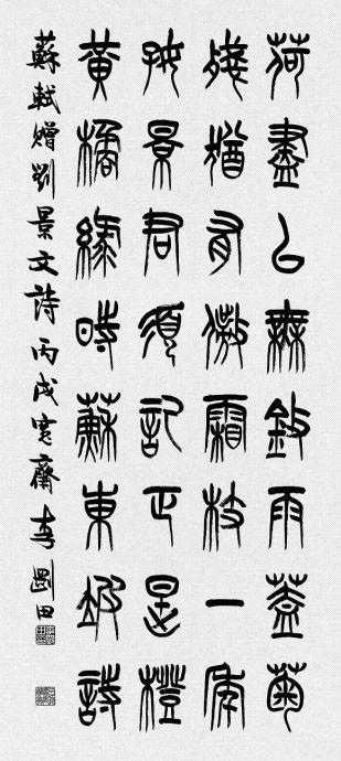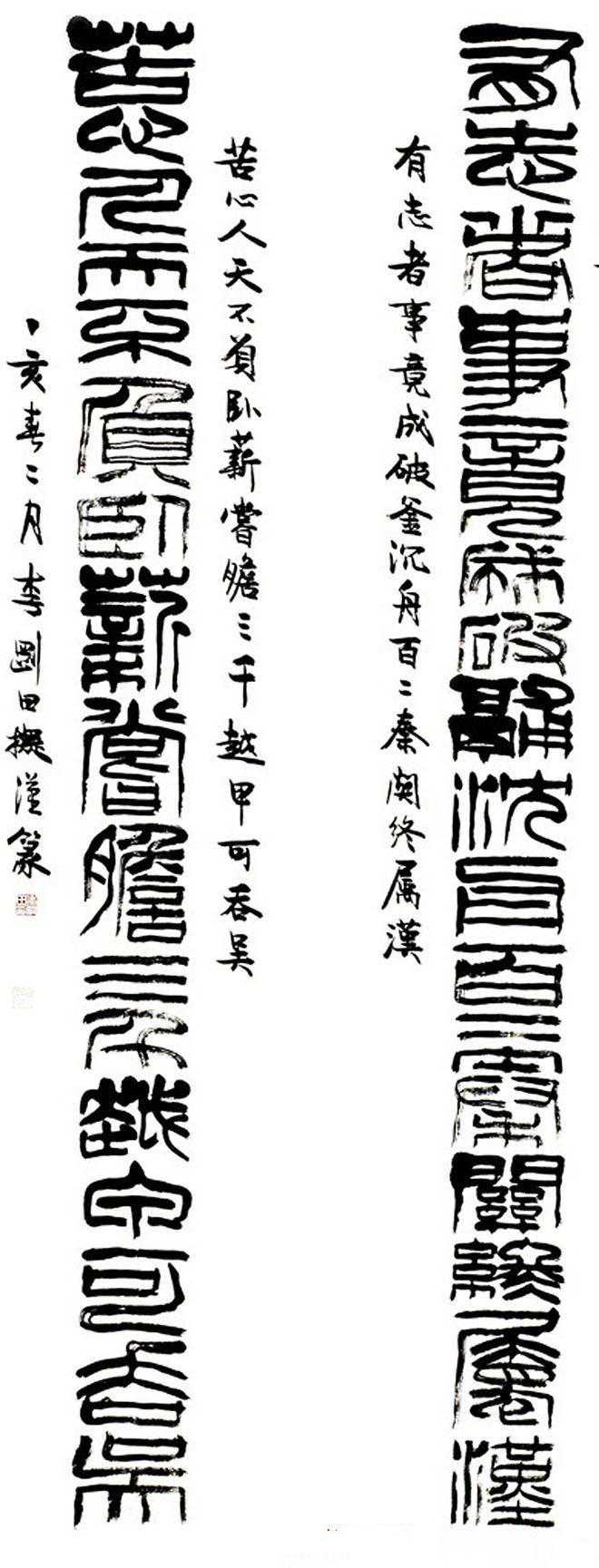 杜甫有句诗:“不薄今人爱古人,清词丽句必为邻。”这应该作为我们对篆书创作中理性与表现性的态度。没有理性的支撑就没有篆书,而没有表现性的手段就没有篆书艺术创作。在创作中,笔墨的律动、激情的宣泄,是立足于理性的基础上的,二者不可偏执,问题仍然是如何把握这个“度”,艺术创作的高下成败,其实只不过是作者把握“度”的能力的表现而已。