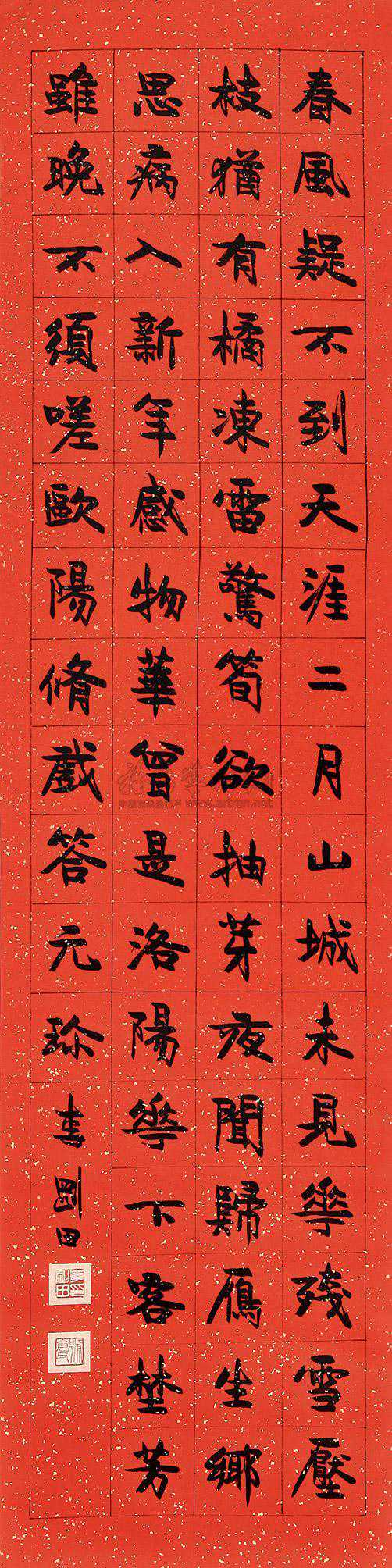 例如,我们进行以甲骨文特点为主调的书法创作,殷商甲骨文遗存的文字不多,集一篇诗文联语,有时会遇到只缺一两个甲骨文中没有的字而难以成篇,这样的情况,如果从文字学的立场出发,那只好舍弃这个创作构想,如果从书法艺术创作的立场出发,我们认为不妨取金文中的字使之“甲骨化”,求艺术形式统一而不必过多顾及文字的“杂乱”。以此例类推,进行以金文为主调的书法创作中,所缺之字不妨以秦篆之体“金文化”用之;如作小篆为主调的书法创作,所用之字不妨用汉篆甚至是部首偏旁凑合使之“小篆化”而用之。此类作法,清代书法家早就开始运用了。但这种杂取变化要以精通文字为基础,要变得有根据,有道理,要针对不同的字采用不同的权变方法,不可概而论之。总之,篆书艺术创作的用篆原则应是不求文字学意义上的“纯粹”性,而求艺术形式美的“统一”性。