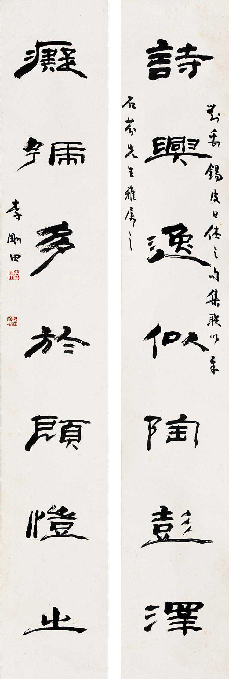 吴昌硕专学《石鼓文》数十年,《石鼓文》的原型是平正舒和的,但吴昌硕从艺术创作的角度去学习石鼓文,把石鼓原型作为素材,字势不受原帖所囿,大胆变化出新,用笔也不被石刻所缚,得凝练遒劲之妙。字势融入邓石如篆书的修长体势,结构加强疏密对比,又融入行草书意,抑左扬右,峻拔一角,通过字的攲侧变化表现出势态之美。其用笔可以说是受邓石如以隶法入篆的启示,而以金文写石鼓文,苍厚古拙,从字势到笔意形成自己独特的篆书样式,对当代篆书创作产生了极大的影响。当然,在吴昌硕之前,已有书家开始以草法入篆,以侧势入篆,只是这种篆书的侧攲之美到了吴昌硕手中开始典型化,对后来书篆者产生了极大的影响,因为这种对侧攲美的追求能符合艺术创作的规律,所以具有极大的艺术生命力。