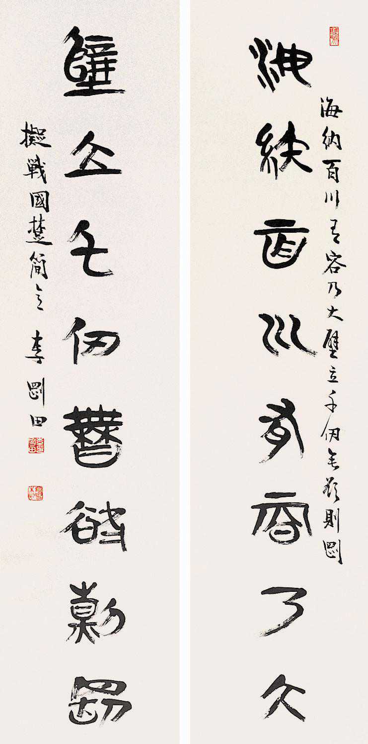 其二,谈谈篆书的对称之美与变化之美。自秦石刻小篆作为小篆的典型样式以来,篆书一直在追求一种中正冲和之美。唐太宗形容这种美:“其道同鲁庙之器,虚则攲,满则覆,中则正。正者,冲和之谓也。”邓石如对篆书的变革,使其笔法的单一性变为丰富性,使其线条的圆转为方圆兼备,使其结构的舒和之美变为疏密对比之美,但未敢变其结构的正势,未变其结构基本对称的美。直到邓石如之后一百年的吴昌硕,开始把篆书体势进行了由正到侧的变化。