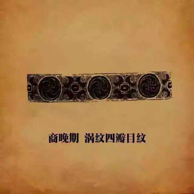 涡纹:又称“火纹”,形状近似旋转的水涡,也有学者认为这种纹饰代表太阳,中间的弧线表示火焰的流动。这种纹饰流行的时间很长,从夏代晚期到战国从未间断。除了单个使用外,涡纹还常与其他纹饰配合使用,比较多的是龙纹、四瓣目纹、雷纹等。