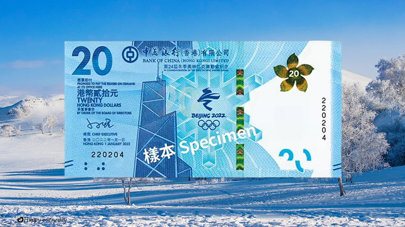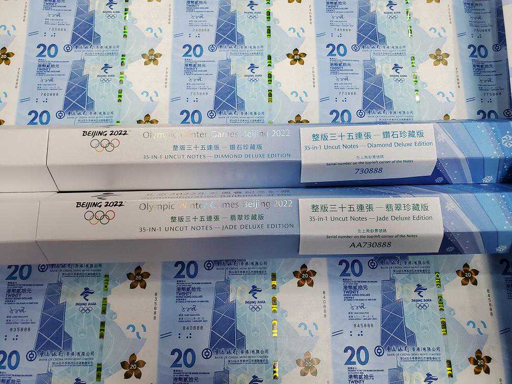 剩下的,分别是香港和澳门发行的冬奥会纪念钞。这两张纪念钞除了发行方式和币面不一样外,其它数据倒是相同的,面值都是20元,都只发行了200万张。