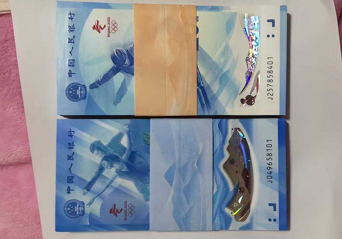 我们最为熟悉的,自然是冬奥会对钞。它们的面值是20元,一套2张,发行了2亿套。