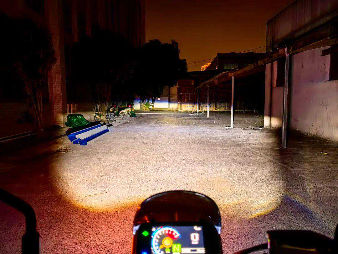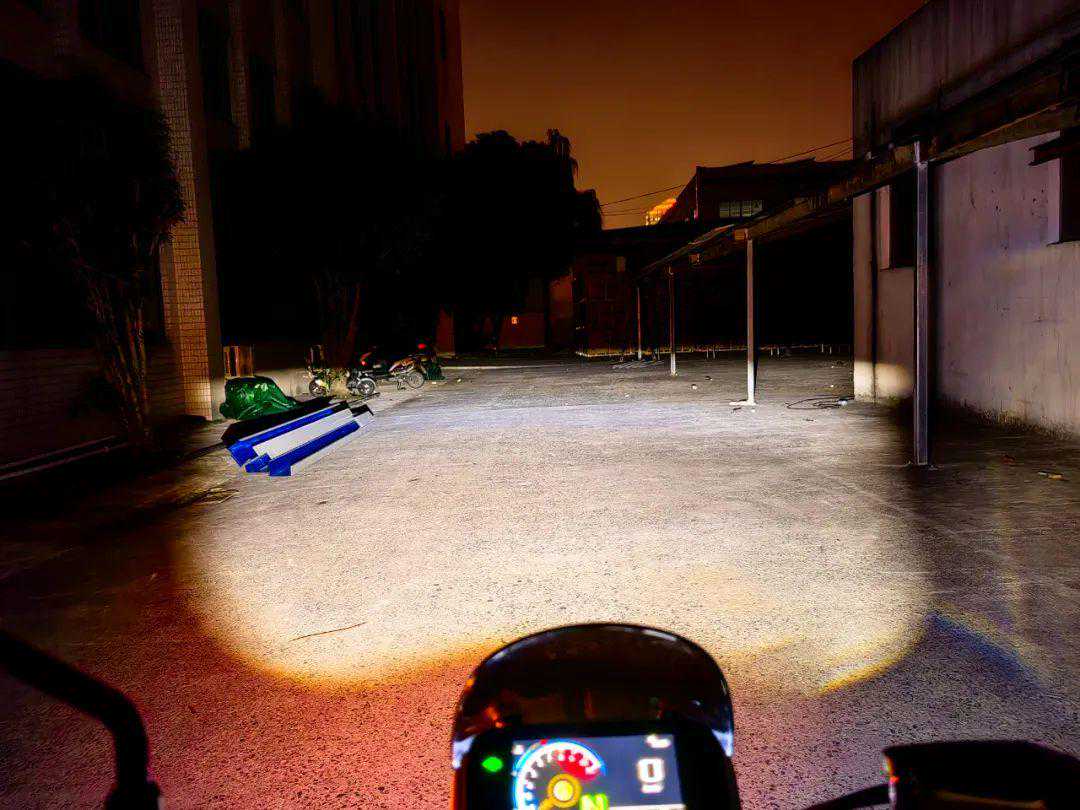 这组大灯设计不但好看有特色,更重要的是灯光铺路效果非常赞,能非常均匀地铺在前方,亮度非常高,而且光斑聚而不散,像刀切的一样,尤其开远光,近光同亮,一起照亮效果很棒。