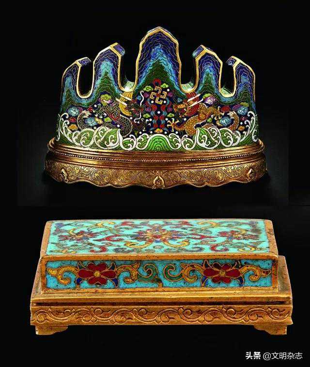 ↑铜胎珐琅,龙纹笔山。掐丝珐琅,勾莲墨床,乾隆。